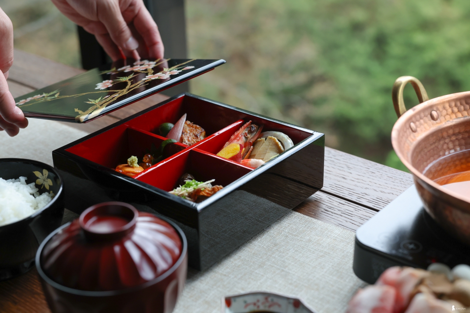 雖然沒有嵐山的紅葉,但眼前是谷關墨綠深邃的山巒與氤氳水氣。服務人員端上的,是由台灣漆藝家吳樹發親手打造的「櫻花漆器食盒」。黑色的漆面上,白粉色的櫻花蒔繪在晨光下閃耀,彷彿呼應著窗外的自然光景。掀開盒蓋,川西和人料理長設計的山海朝食如珠寶般陳列其中。