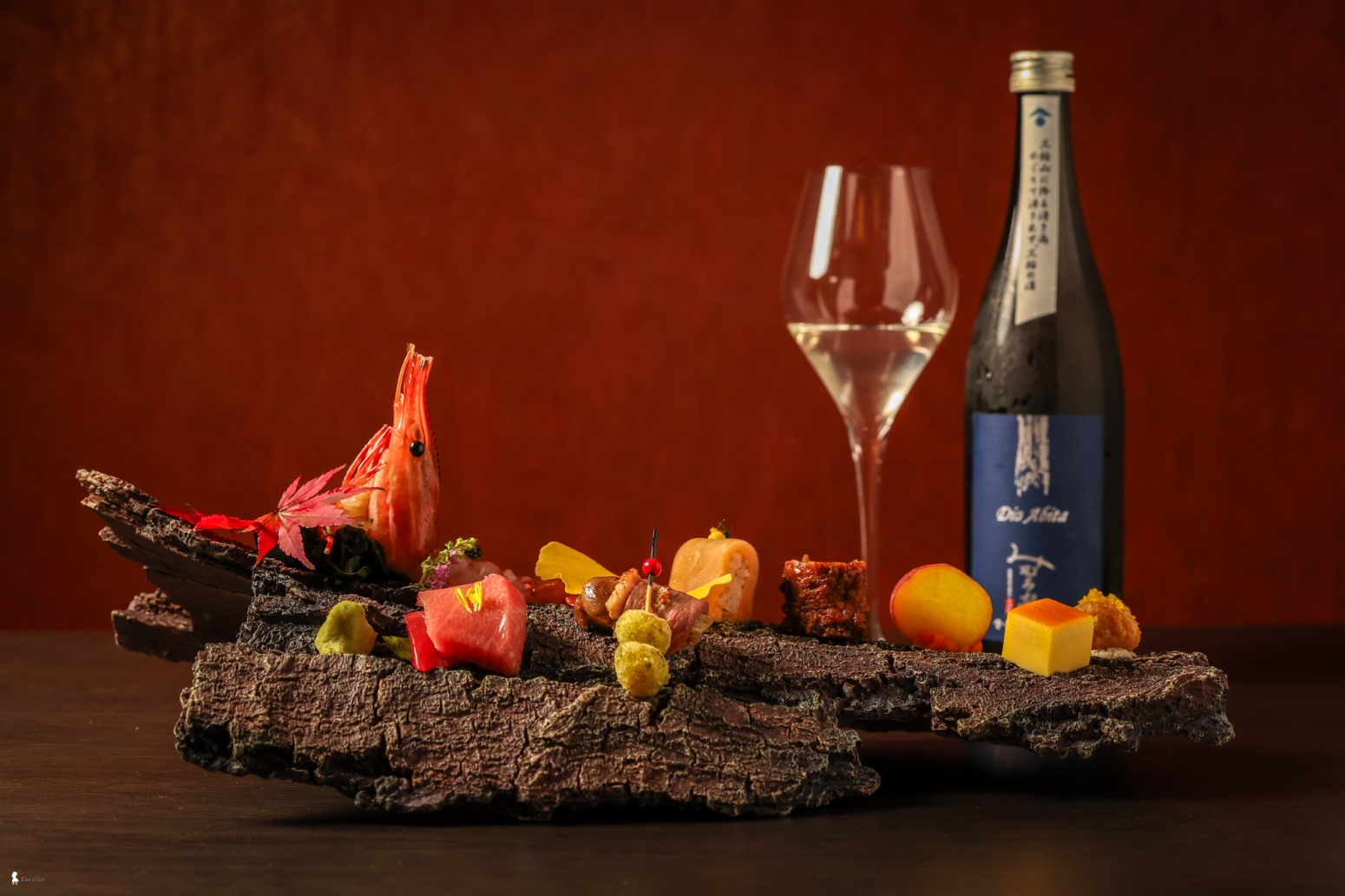 ⇑ 會席料理的「寶樂盛」,是新任料理長創新在地化的代表作。使用粗獷樹皮作為餐盤,將日式懷石的精髓與台灣在地食材巧妙結合,極富巧思