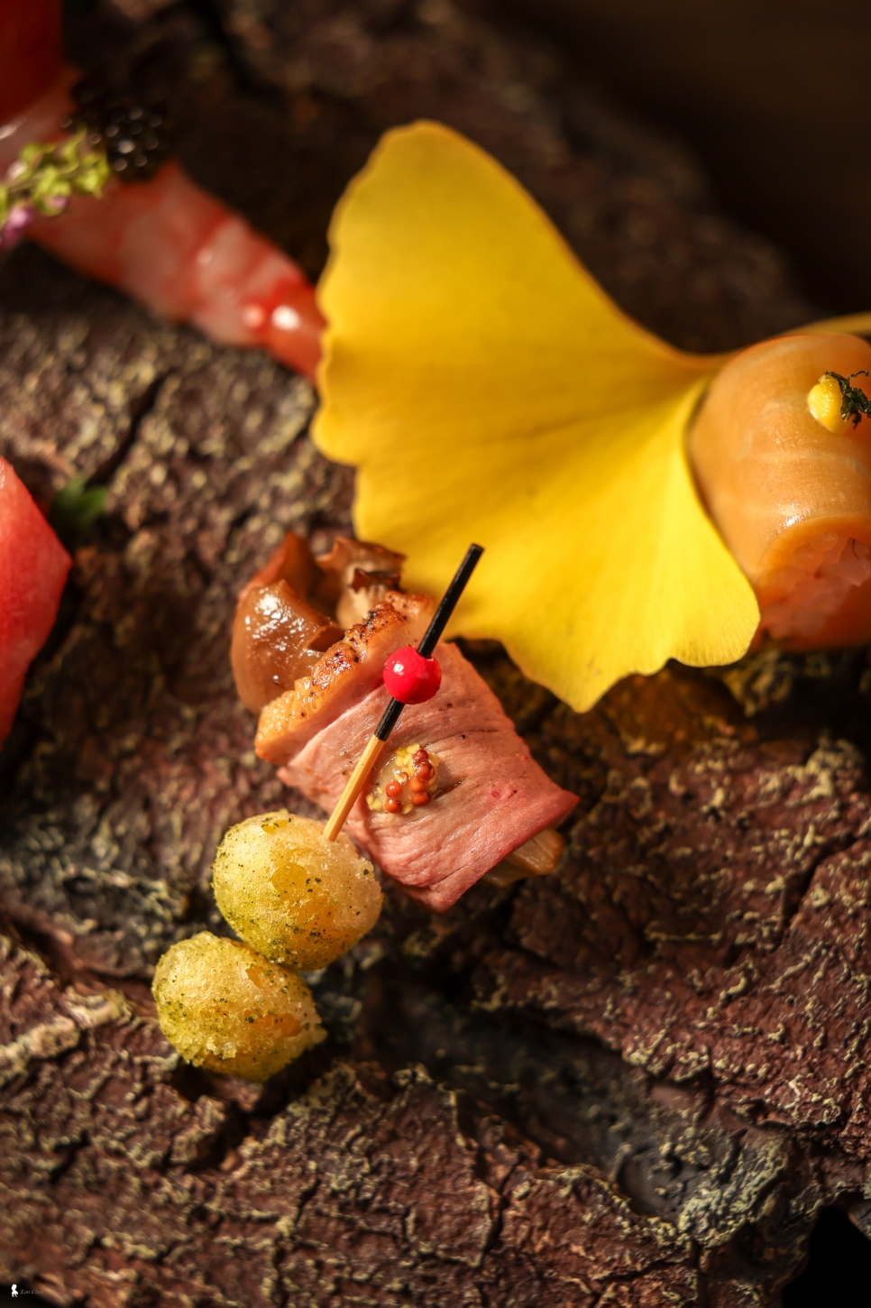 我對這場饗宴的註解是:「濃重秋色中有台灣在地隱味。」川西料理長以日式懷石為骨架,卻巧妙地將台灣在地食材揉入其中。晚宴的開端「寶樂盛(八寸)」一上桌就極具視覺衝擊力,食材被盛裝、擺放在粗獷的樹皮器皿上,宛如一幅立體而狂野的秋日畫作。其中那枚不起眼的銀杏,表面竟裹上了「刺蔥」麵衣油炸,一口咬下,那股特殊的辛香氣息瞬間在口腔迸發,將台灣山林的隱味帶入日式小點的精髓。