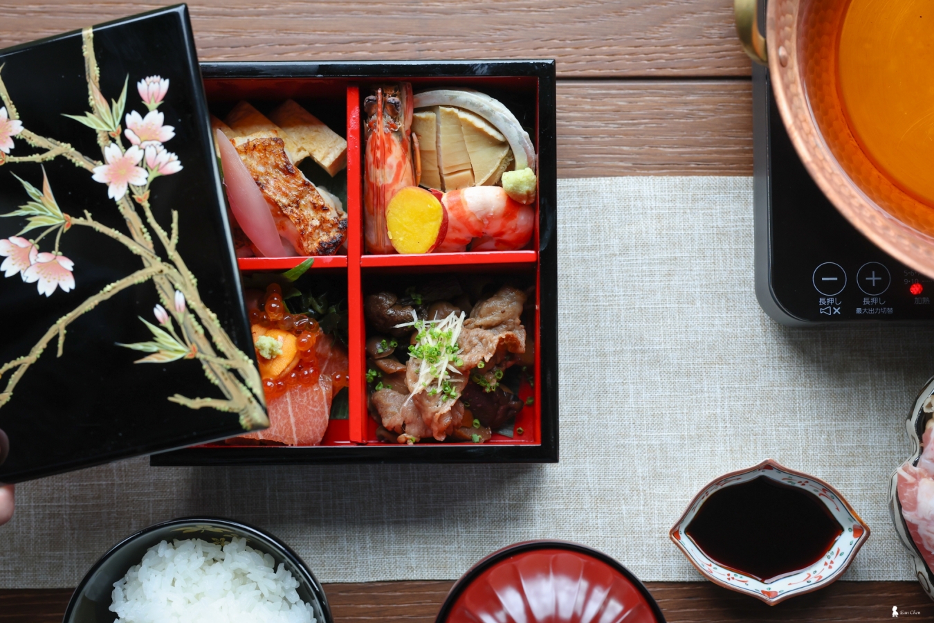 ⇑ 專案活動提供的「蒔漆朝食」,是使用台灣藝術家吳樹發親手打造的櫻花漆器食盒盛裝