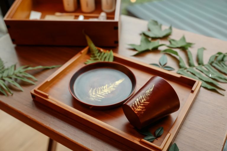 這並非一般的 DIY。我們手中的漆器杯,是光山行經過 14 道繁複工序、耗時一個月製成的半成品。賴老師帶領我們運用虹夕諾雅 谷關「水之庭園」裡的植物作為素材與靈感,將其拓印在漆杯上,再撒上金粉。當金粉落在漆上,植物脈絡瞬間變得立體並具意境,這不就是最具紀念意義的「谷關塗」嗎?