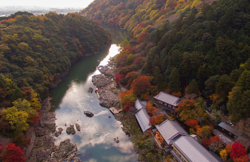 ⇑ 矗立水邊的虹夕諾雅 京都,在深秋被五彩包圍(照片由虹夕諾雅提供)