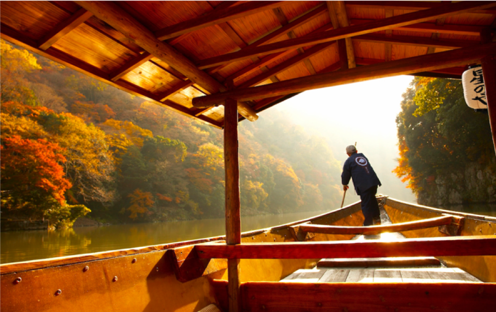 ⇑ 清晨搭上輕舟劃破大堰川的寂靜(照片由虹夕諾雅提供)