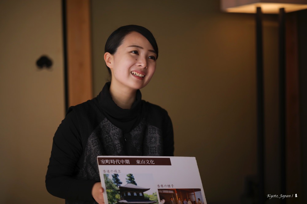 我參加的另一個全年度體驗活動「聞香」也很經典。香文化是在六世紀隨著佛教傳入日本,據說在戰國時代,軍事將領將聞香作為離開戰場後的放鬆方式。在 40 分鐘左右的時間裡,會帶領快速了解日本香文化的歷史並認識香木,接著實際操作正宗工具來學習如何使用木炭、香灰來製作香爐,最後會提供每人一小片最高等級的香木「伽羅木」,以聞香儀式透過嗅覺來品味京都的生活之美。