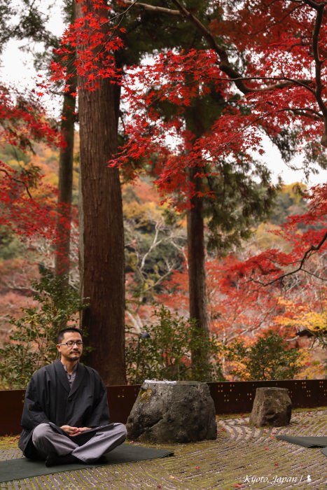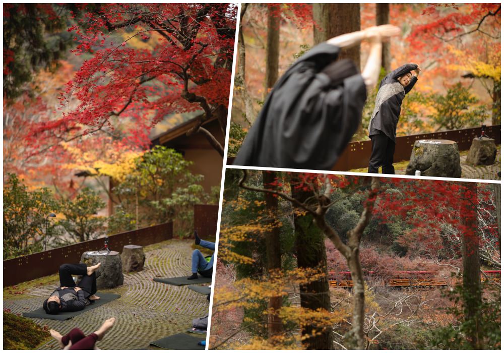 就在同個場景「奧の庭」,隔天早上 8:30 我來這參加晨間伸展活動。工作人員已經先在瓦片鋪設而成的日式枯山水上放好一塊塊瑜珈墊,在會同時說日文與英文的飯店人員帶領下,從簡單調息開始,接著進行多組伸展動作,呼吸著清新空氣,坐在楓紅樹下聽著水流鳥囀一邊動動筋骨,還有什麼比這更棒的方式來開始一天嗎?