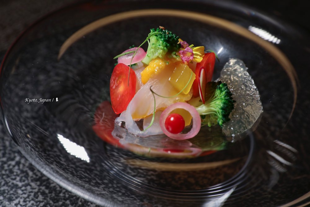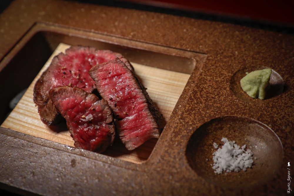 除了視覺、聽覺、嗅覺與觸覺,感受京都之美哪裡能少了味覺!入住虹夕諾雅 京都的第一晚,我在酒店餐廳享用一頓「五味自在」會席料理,使用當季魚類、圓蘿蔔、九條蔥等當地特色食材,料理長久保田一郞以「品嚐冬日滋味」為主題創作了 9 道式、屬於虹夕諾雅的懷石料理。他們似乎很看重並強調「屬於虹夕諾雅的料理」這件事,英文菜單上,不只一道料理提到「in Hoshinoya Style」,例如生魚片的擺盤就宛如我造訪時的深秋京都,黃綠紅交織成的秋日花園那樣多彩,帶些法式料理的調味、讓生魚片猶如雞尾酒般呈現,這即是虹夕諾雅的 style,傳統烹調手法再加上創意,將當季食材玩出變化,讓人耳目一新。這套的主餐是烤牛肉,端上來時,一塊塊牛肉被放在一顆顆燒燙的石頭上保持熱度,一嚐、真不得了,這牛肉沒在客氣,詢問服務人員,果然,用的是和牛,為「黒毛和種」(くろげわしゅ)。