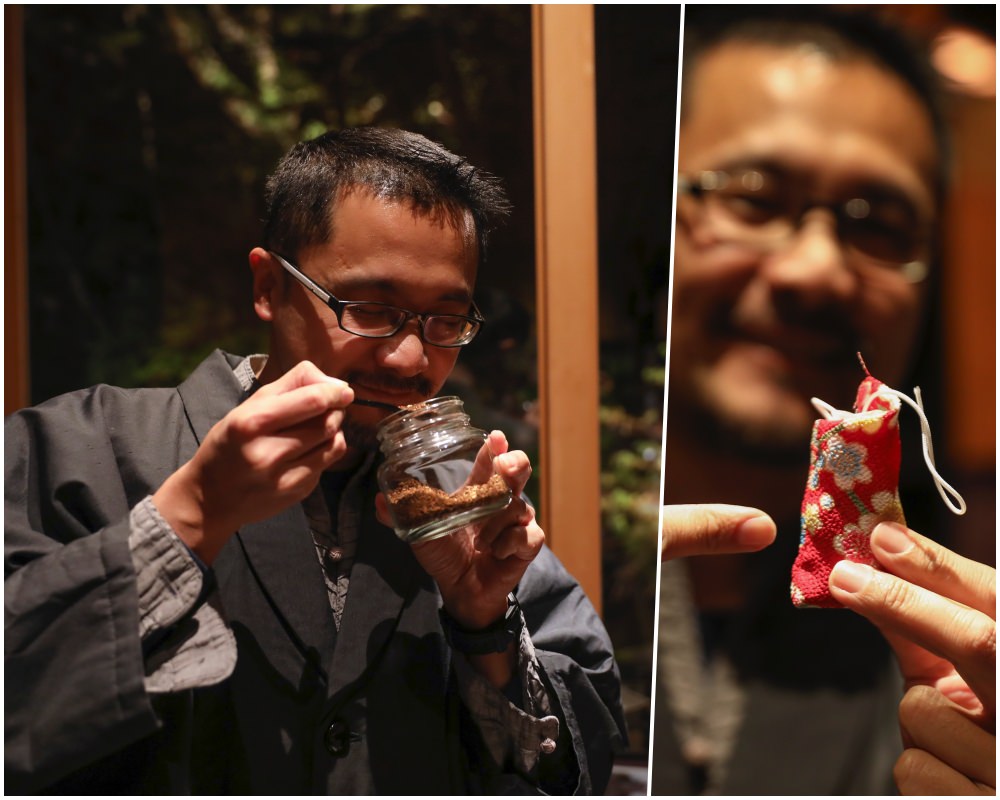 說到香,晚上我來到 24 小時開放的 Library Lounge 做安眠香包,三款不同味道的香料可任意以不同比例搭配調和,製作專屬香包,回到房間放到枕頭周邊據說有助睡眠。舒服的泡杯茶、翻翻書,最後拿著香包回房間,這虹夕諾雅 京都的夜,好風雅…