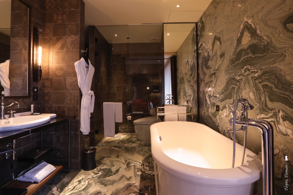 奢侈佔了客房三分之一大,這是個相當出色的衛浴空間!使用義大利山水石如畫展開,在多個雅緻燈具的妝點下,增添空間貴氣。淋浴空間大,使用的備品味道也舒服,我還發現貼心的在黑金石的洗手台上放了一包茉莉味道的沐浴鹽,款待房客可以躺在很大的獨立浴缸裡,好好泡個澡。