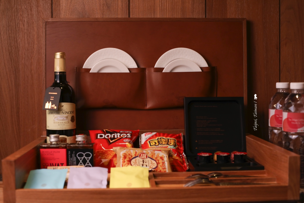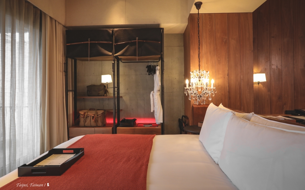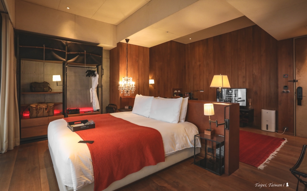 這間臥室裡主要的奢華感,當來自低垂的床頭水晶燈,一旁接連的卻是樸實的清水模牆,倚牆有著荷蘭輕工業風的中空衣櫃,原本竟然是個書櫃。他們把美國 Restoration Hardware 鐵製書櫃去除外殼和門板後,改造成置衣櫃,獨一無二。床邊小小的空間展示了陳瑞憲最擅長的衝突美學,不覺突兀,是膽識也是功力。待房間裡,你一定跟我一樣,會忍不住伸手去摸,不管是門後的絲絨、牆面延伸到天花板的米色布,或是包覆床頭的頭層牛皮,是美好觸感也是質感。除了伸手摸,也請儘管伸手去拿,紅銅製的 Mini bar 除了酒、其餘的餅乾飲品都是免費,此外搭載環繞效果的 YAMAHA Soundbar 音響的視聽設備也於房客入住期間提供 120 部免費電影隨時觀看,為的就是要讓房客如在家一般的自在,同時也再次的呼應飯店理念 ’’Indulge Yourself’’。