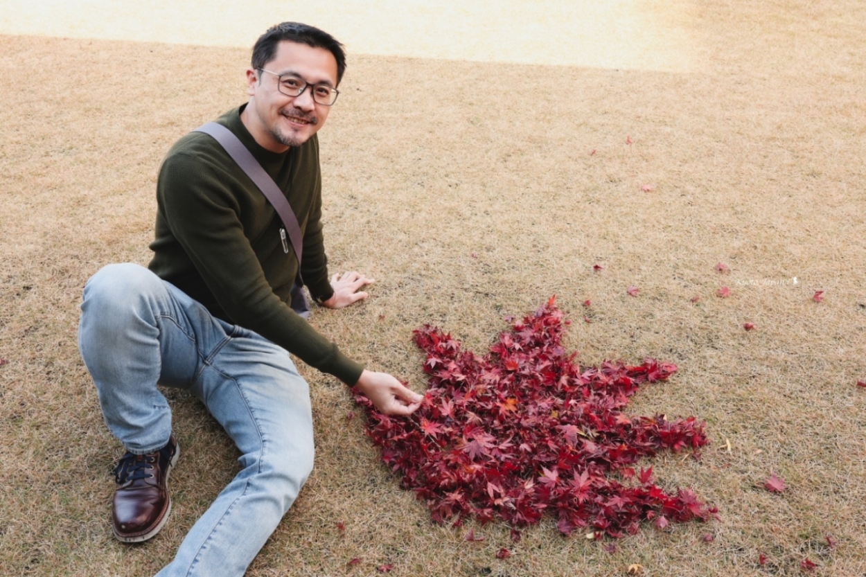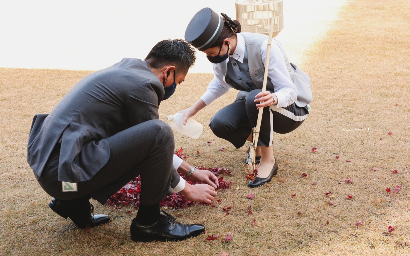 這天早餐後我散步庭園,時值紅葉見頃,飯店人員正在清掃落下的楓紅一片片,我拿著相機蹲在成堆的紅葉旁拍照,一位男性飯店人員在旁看到,用日文跟我說了幾句順帶用手比了一下,我不懂意思,但大概可以確定他們接下來忙著投入的事是為了我而做,我有些不好意思,暫時先走遠一下。從旁偷瞄,只見他們拿水噴楓葉並齊力用手撥堆捧,我心中打定主意再走回來時一定要拿相機拍一下,那是心意。動作方停、我走近一看,為了讓我拍照、他們竟聯手排了一只大楓葉,真是太有心、也太可愛了,這樣的服務,怎麼可能讓人不打從心底喜歡呢?