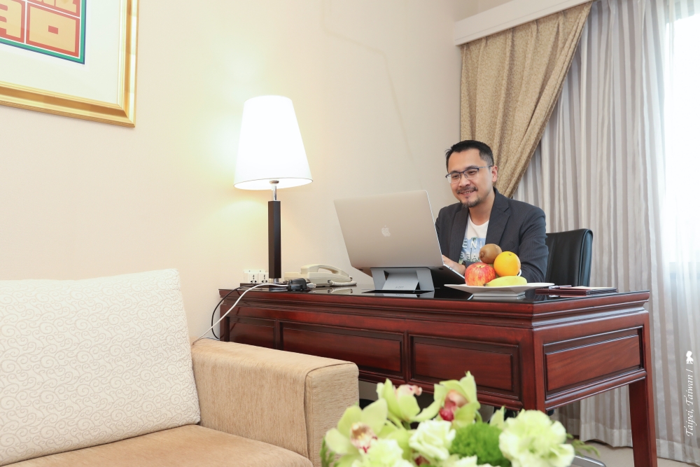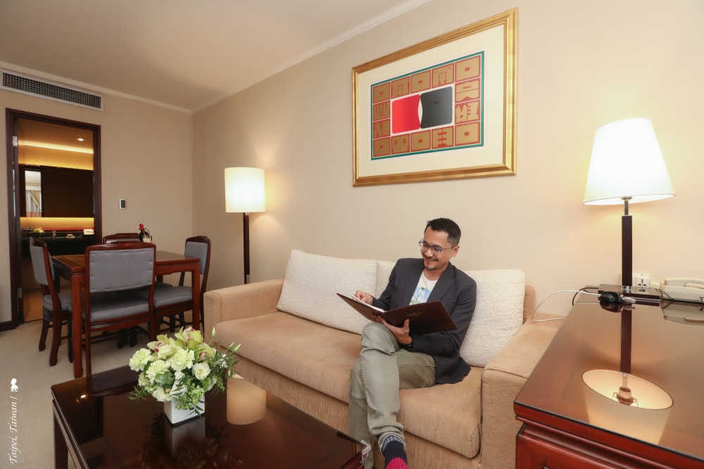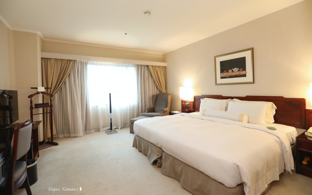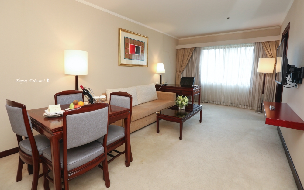 飯店已 36 歲,不過客房的地毯與壁紙約在三年前換新過,不顯老舊,房間裡中式家具的沉穩,搭配米白地毯、壁紙與沙發,在視覺上不會太重又能呈現一種經典的美好。該房間最深得我心的是擁有兩面採光,相當明亮,可以俯瞰仁愛路的綠廊道,帝寶就在視線內。難得的台北蛋黃區住宿體驗,深切感覺到地點的便利性。