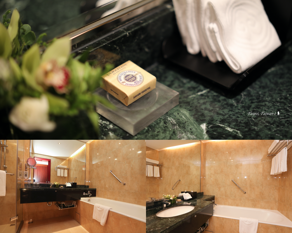 這回我入住最高的 13F 行政樓層,門上刻著 Rosewood Suite,是 20坪大的尊爵行政套房,一半是客廳、一半是臥室,跟不少飯店套房一樣,在客廳有間客用洗手間,而臥室還有一間配有浴缸的衛浴,備品使用歐舒丹,整體質感不錯。