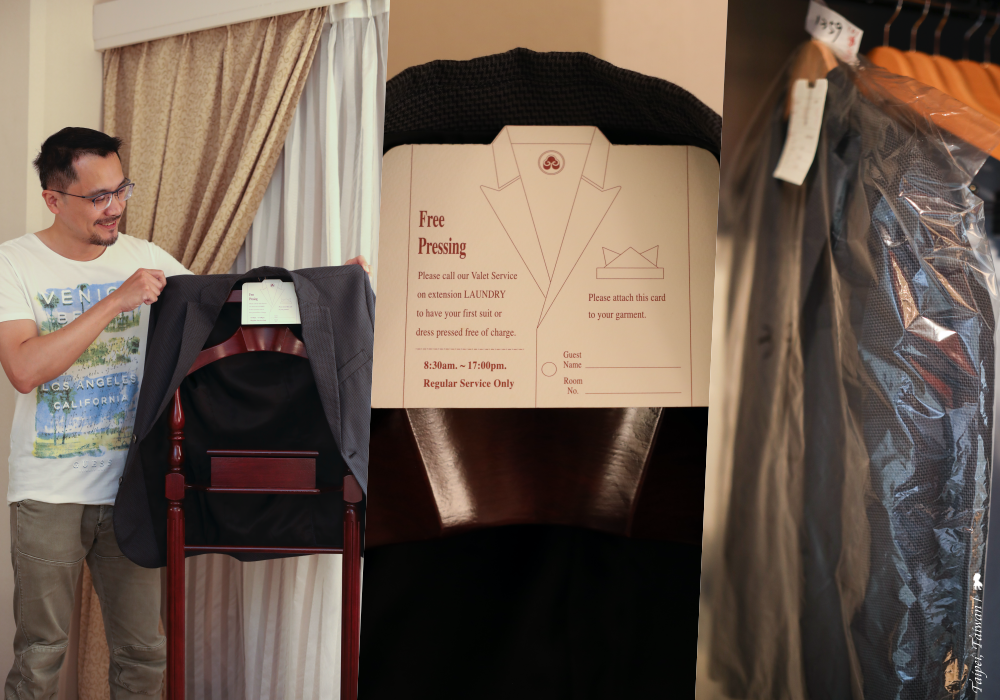 走進臥室,窗邊放了一個原木的站立式衣架,我很直覺把脫下的西裝外套掛了上去,發現有個牌子,上面寫著憑該卡可免費享有一次西裝/套裝的燙熨,該服務尤其對商務人士是相當實用的貼心服務!想到帶的這件西裝外套是前陣子才剛入手不久,尚未正式被燙過,剛好、交給專業的來!打完內部專線,很快的有位伯伯來收外套並詢問何時需要。後來,其實我也忘記送熨的這件事,隔天打開衣櫥,已完成燙熨被妥適掛好,這樣的服務讓人安心。