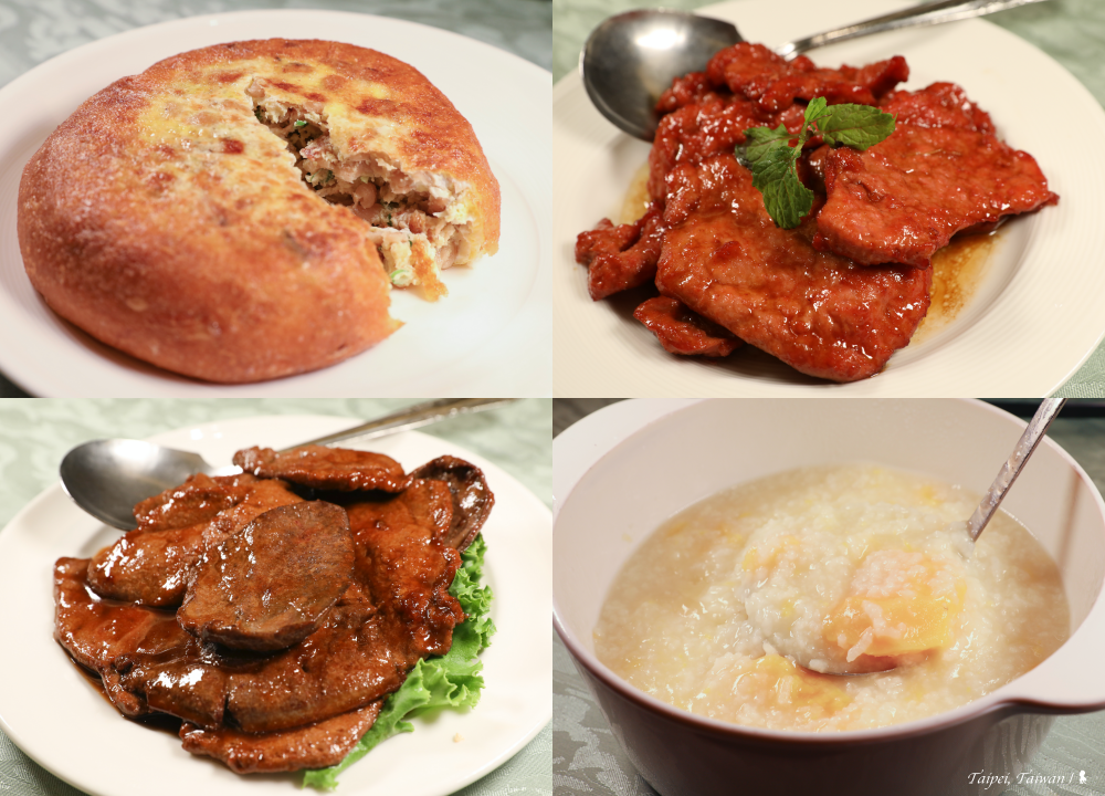 ⇑ 左上起順時針分別是菜脯蛋、軟煎溜肉、地瓜稀飯及乾煎豬肝