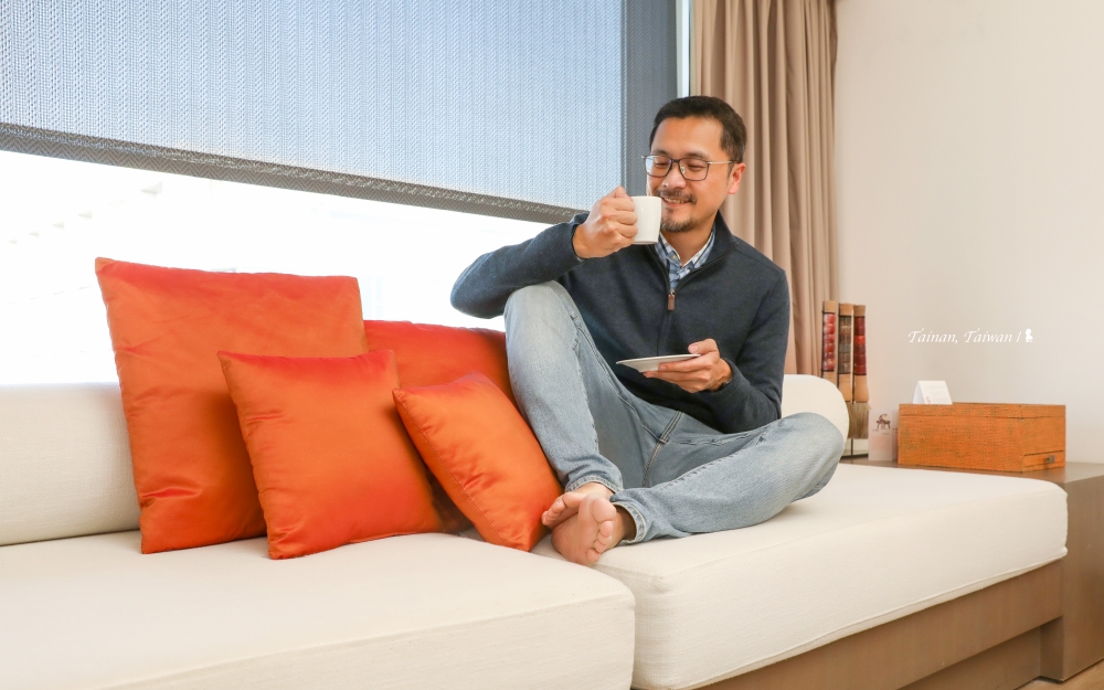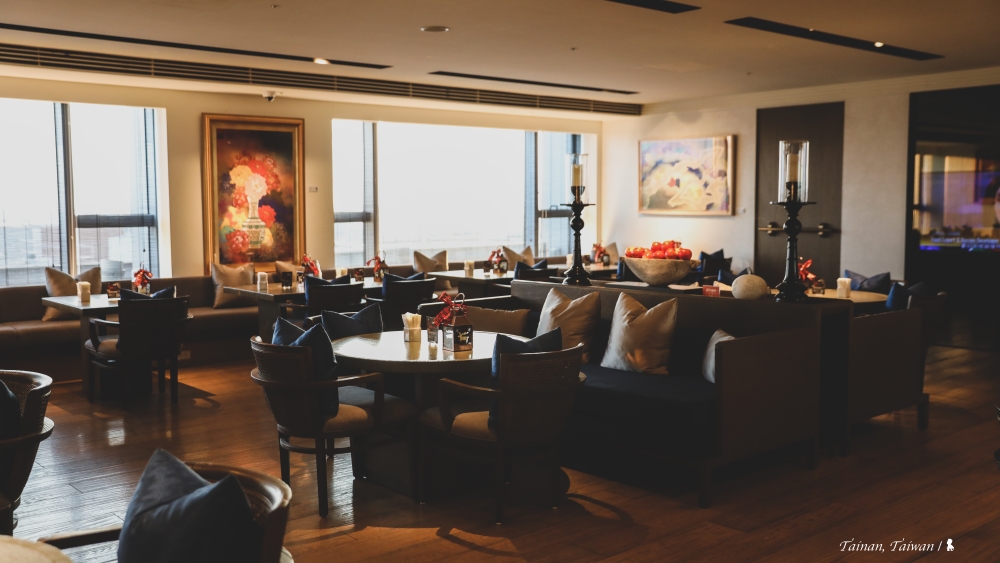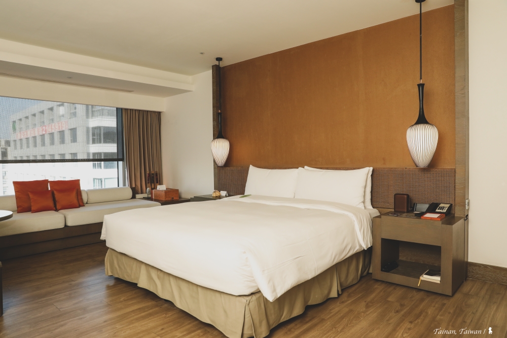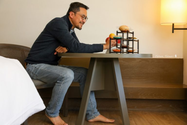 12 坪大的客房蠻寬敞,頂樓的開闊視野也相當加分,台南味的迎賓點心有椪餅、愛文芒果等多種果乾蜜餞,放在如多寶閣的展示架上,跟房間裡的毛筆燈等充滿古味儒風的裝飾元素相映成趣。(若對台南晶英酒店精彩的設計元素與理念有興趣,可參考上回寫的詳細開箱文