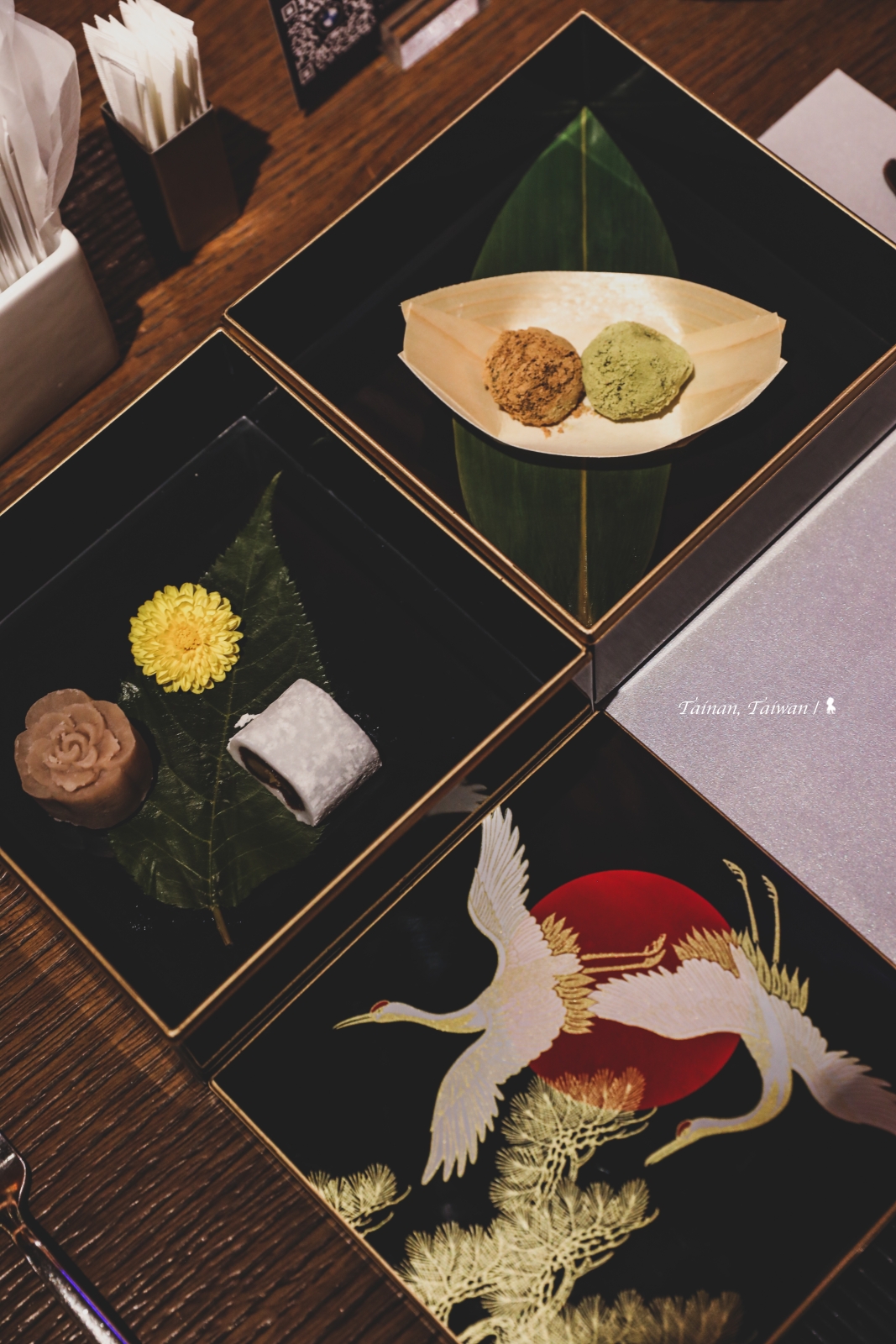 這餐亮點是「龍蝦鬼瓦燒」,B.B 主廚說鬼瓦是源自日本民間傳說,將龍蝦頭剖半對開後,因長得像日式傳統建築屋頂四角常見的「獸面瓦」而得名,見他將甲殼微煎至帶有香氣後,再放上蛋黃、海膽、魚卵、起司等配料,連同新鮮龍蝦肉一塊炙燒,一口咬下,彈牙香濃,實在太滿足!最後就連甜點都很日式,繪有仙鶴的傳統紅黑色漆器,打開後是經典的蕨餅等日本點心。對了,記得要空些肚子給 ROBIN’S 非常棒的沙拉吧及甜點吧。融合懷石與鐵板燒料理的這一餐,我有被驚艷到,B.B 主廚說他們每季都會換一次菜單,我已忍不住開始期待下回再訪。