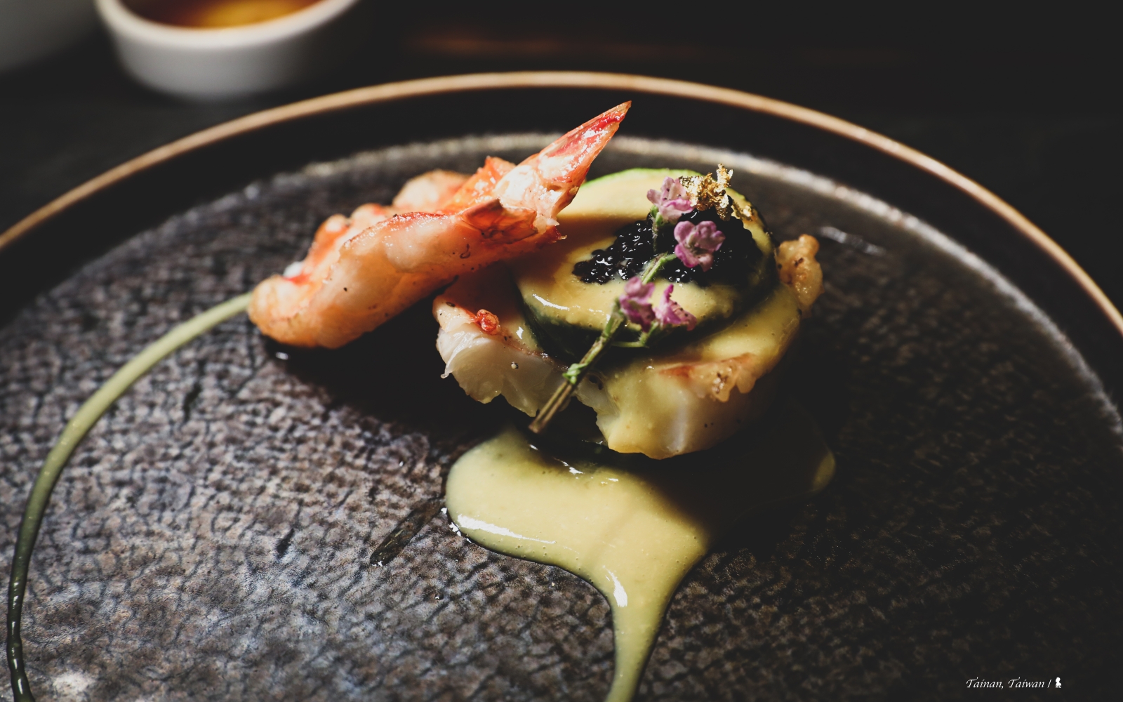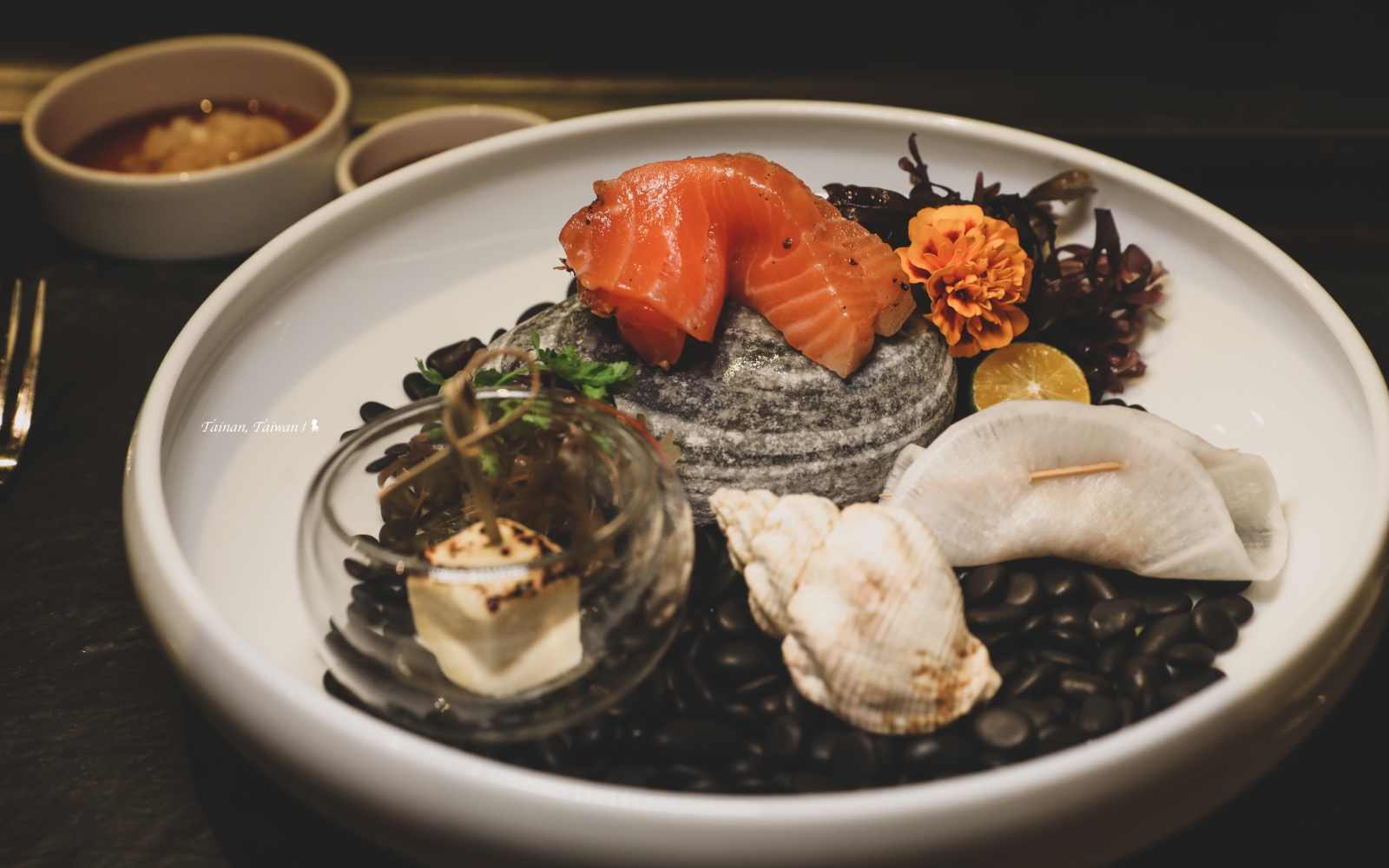 趁入住台南晶英,把握機會再到飯店一樓的 ROBIN’S 餐廳享用歲末大餐!上回沒見到 B.B 鄭安宏主廚,這晚終於得見、且很幸運這餐就由他服務,實在有口福!去年吃的是秋季菜單,這回剛好遇上推出全新的「日風和食鐵板燒」,確實是很特別的鐵板燒體驗。料理設計上講究食物原型,美味不減,但在器皿選用與擺盤上更加講究,因為 B.B 是日本料理出身,這部分原就是他所擅長。不僅如此,來自小琉球的他,在擺盤上還注入海洋氣息,這在開胃前菜三式就可感受到,鋪滿石頭、海藻與貝殼,上頭擺放了時令生魚切片、白蘿蔔薄片夾蟹肉、味噌醃漬奶油起司,味覺與視覺都充滿了海味。