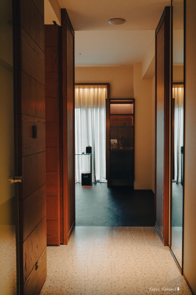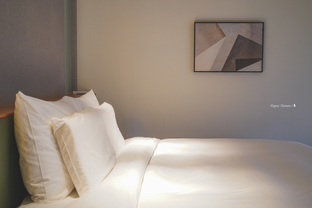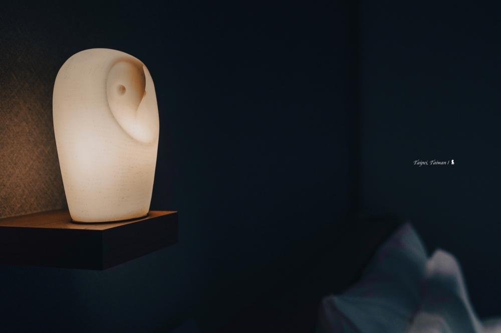不愧是寒舍集團出品,寒居酒店整體來說確實有質感,飯店用貓頭鷹當吉祥物,除了客房的命名,房間裡頭還會擺設貓頭鷹夜燈,就連肥皂都是貓頭鷹造型、相當可愛。這回是入住約 10.5 坪大的「隱鴞客房」,撇除套房算是第二等級的客房,從門口進來後要先走過一個 L 型廊道才會進入主要臥室空間,讓我想到老式公寓的格局,相較低一級房型好像就是多了這個廊道,一開始覺得有些不值,不過後來成了行李箱攤開的置物空間好像也是不錯,能讓客房的活動空間看起來更加清爽!