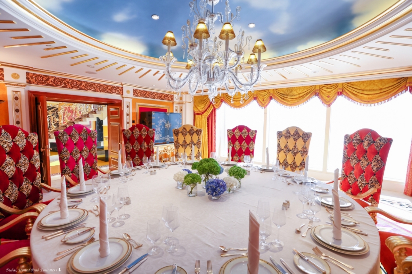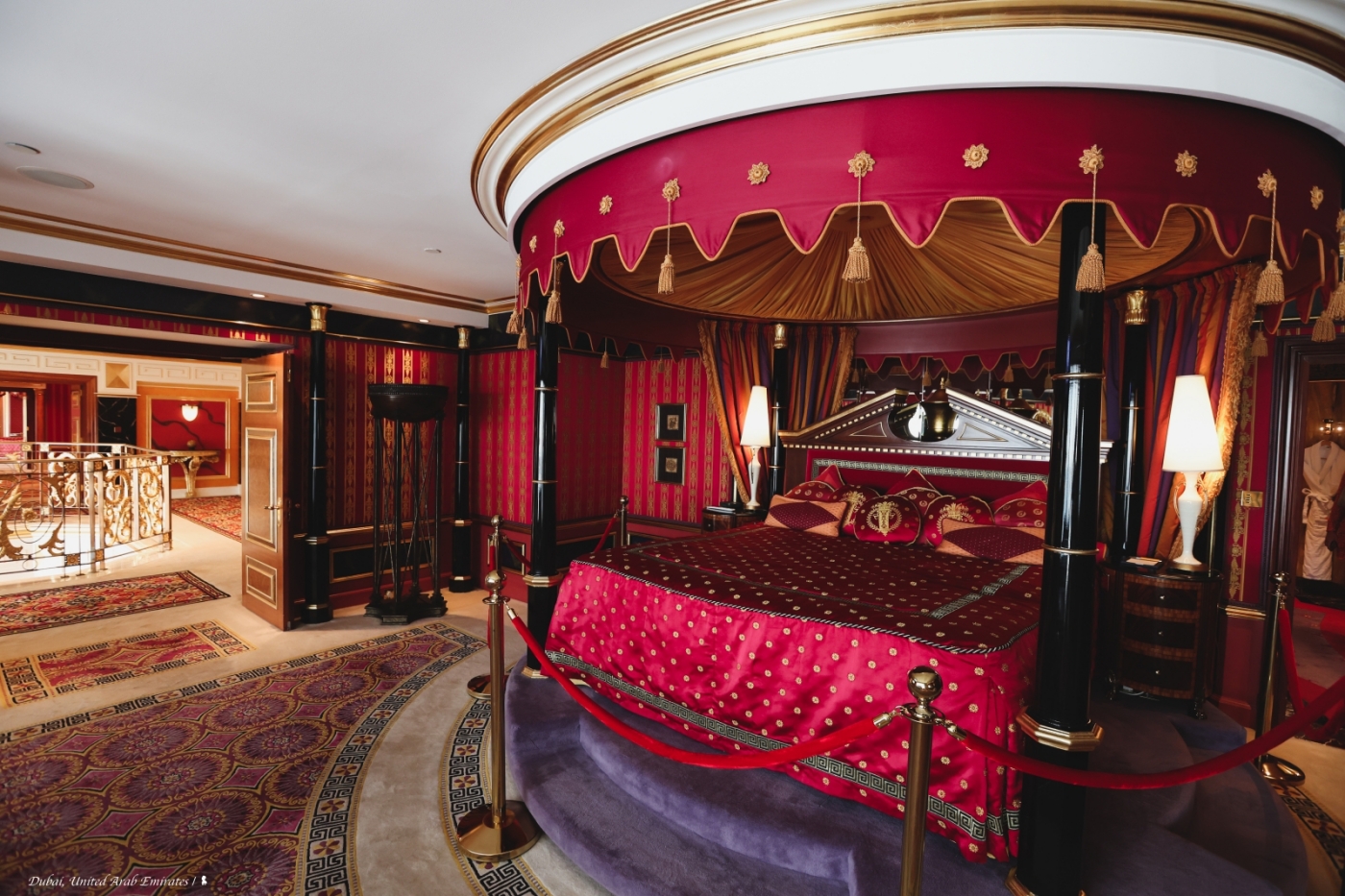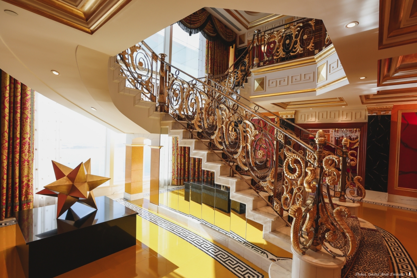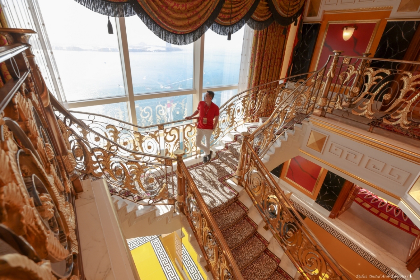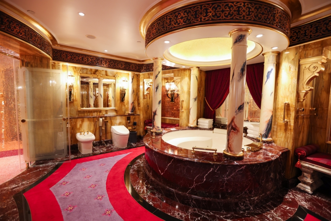 最讓人期待的,莫過於是能打開鍍金門,實際走進住一晚據說要價 2 萬美金的皇家套房。這間總面積廣達 235 坪的套房為兩層樓的配置,一進門首先就看到一座會想起鐵達尼號的華麗旋轉樓梯,上下連接兩間主臥、配有大型按摩浴缸的兩間浴室、圖書室、視聽室、餐廳、大客廳等空間。舉目所見,無處不金,天花板、壁飾、浴室磁磚、黃金電視機等。設計風格是見仁見智,但論豪氣確實就只能佩服!