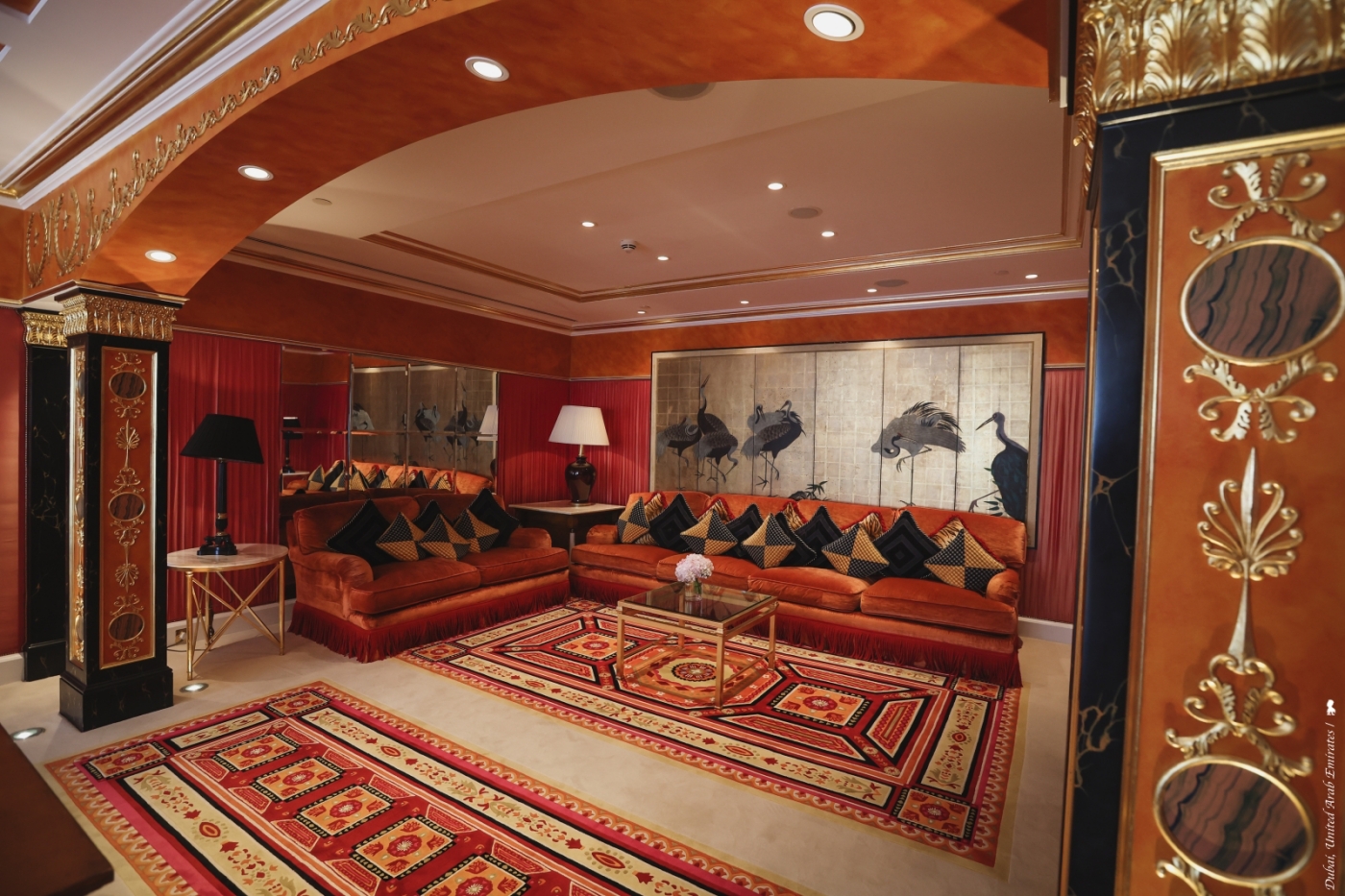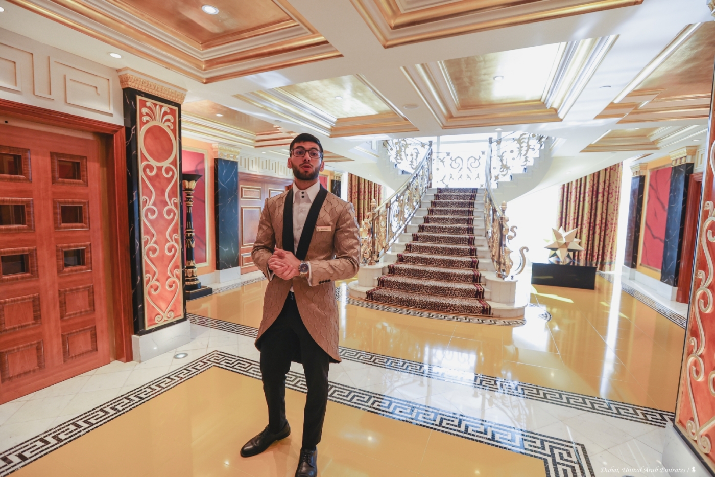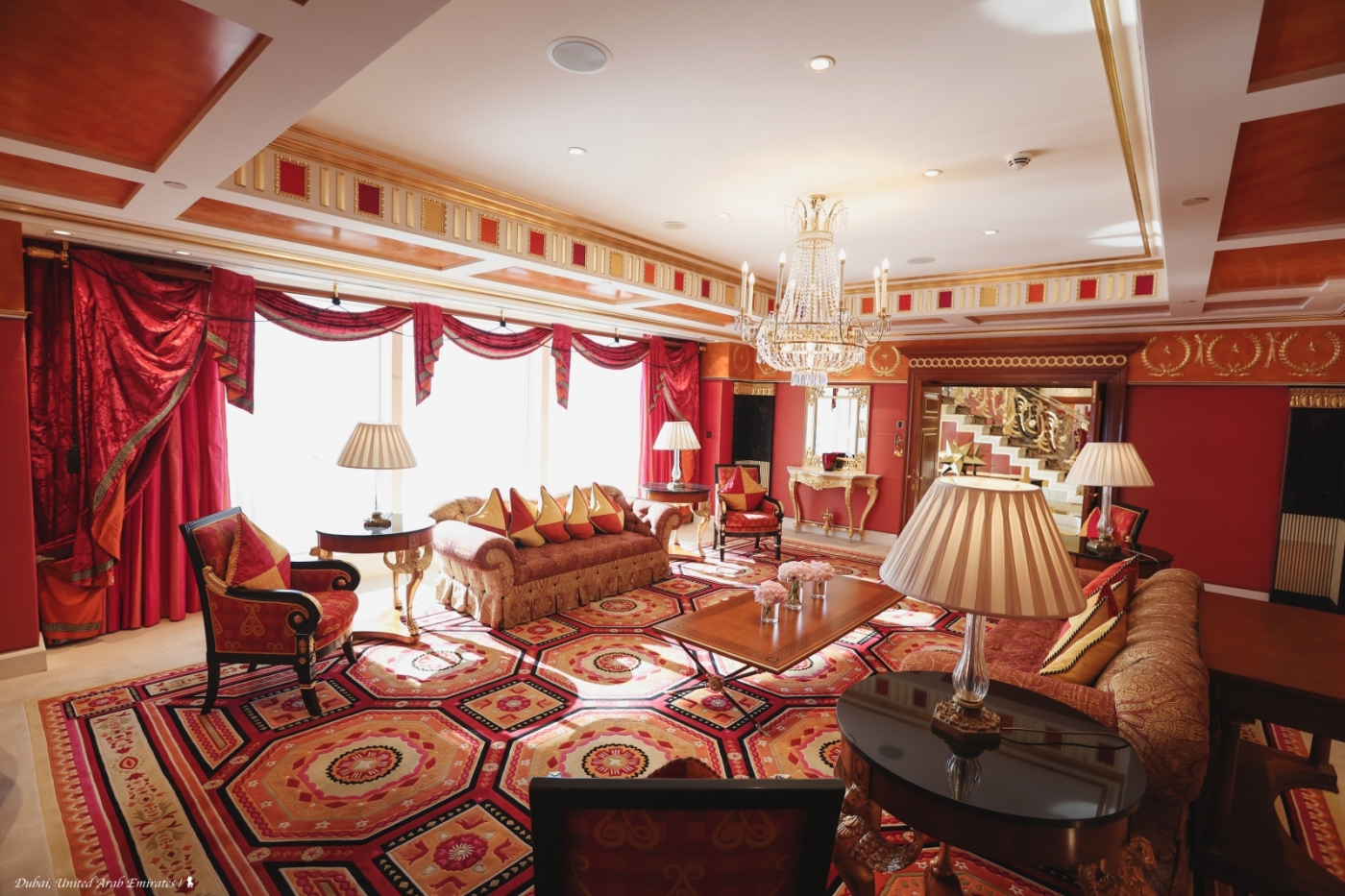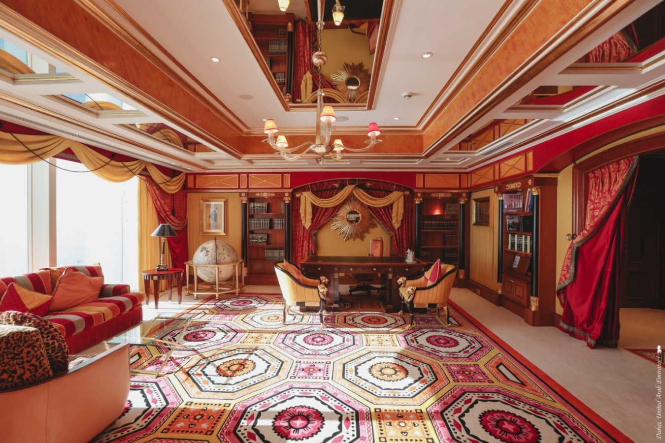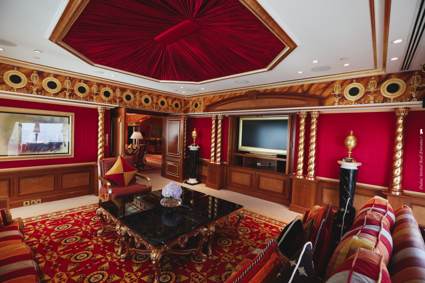 最讓人期待的,莫過於是能打開鍍金門,實際走進住一晚據說要價 2 萬美金的皇家套房。這間總面積廣達 235 坪的套房為兩層樓的配置,一進門首先就看到一座會想起鐵達尼號的華麗旋轉樓梯,上下連接兩間主臥、配有大型按摩浴缸的兩間浴室、圖書室、視聽室、餐廳、大客廳等空間。舉目所見,無處不金,天花板、壁飾、浴室磁磚、黃金電視機等。設計風格是見仁見智,但論豪氣確實就只能佩服!