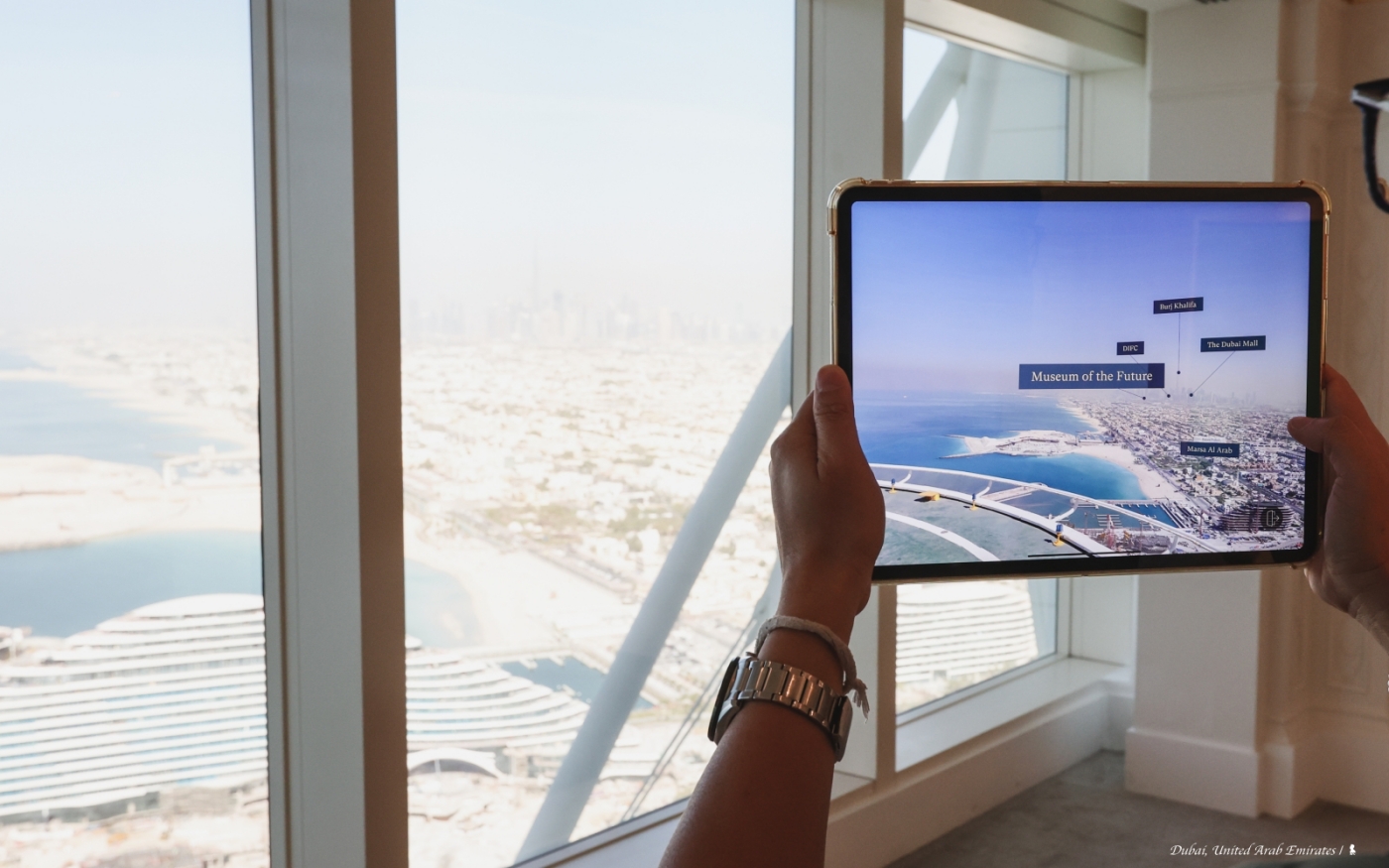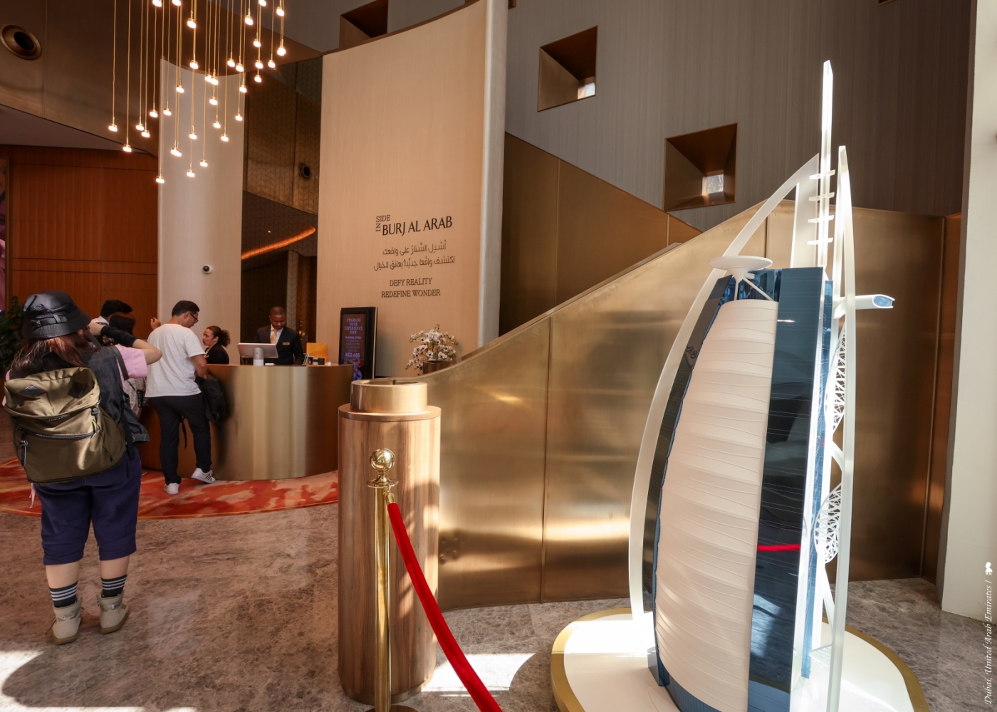 導覽行程目前是從早上 10 點到晚上 8 點,每半小時一梯,遊客可視自己行程與偏好時段提前上飯店官網預約,例如若想欣賞夕陽時分的波斯灣美景,則可先查詢造訪時的落日時間來預訂。整體行程規劃蠻用心,會有專門管家進行導覽介紹,若對帆船飯店的設計與建造有興趣,有像個小型博物館的陳列室可細細欣賞。除有管家、導覽部分飯店還運用了先進科技,像是陳設了一個大餐桌,遊客可自由點選餐廳菜單、藉由互動式投影展示餐點,若視吃滿意了,下回就可考慮來此用餐。另外遊客只要拿起飯店提供的平板,不只能以多媒體方式認識更多帆船飯店的各處精彩空間,若比向落地窗,還能指出肉眼所見的幾個重要地標。