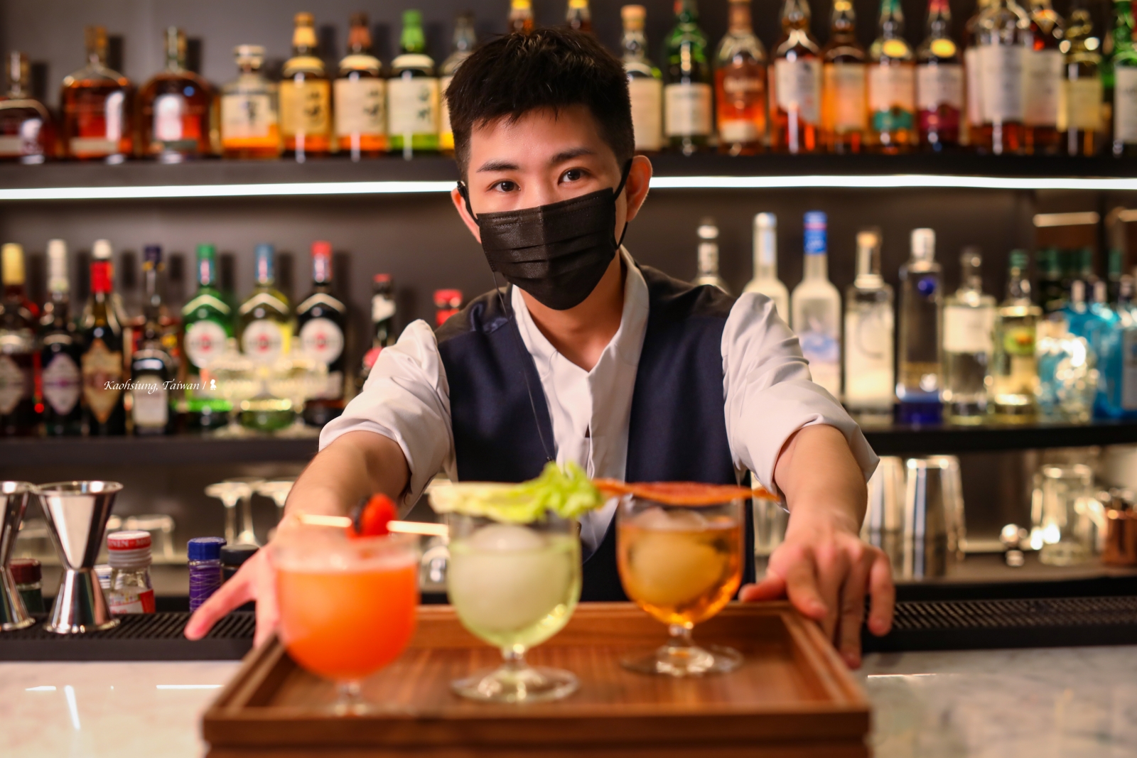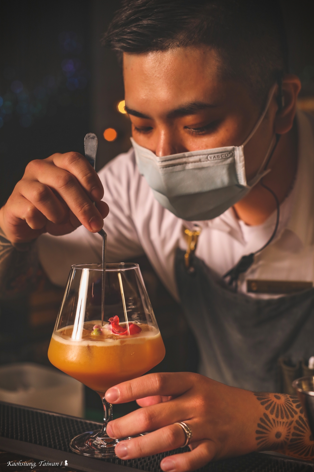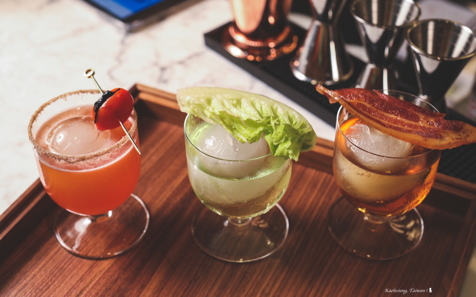 Tomato-基酒選用伏特加與梅酒、番茄汁、蜂蜜,在杯緣裹上甘梅粉,搭配番茄蜜餞,此款調酒特別帶入在地元素融入高雄當地風味。