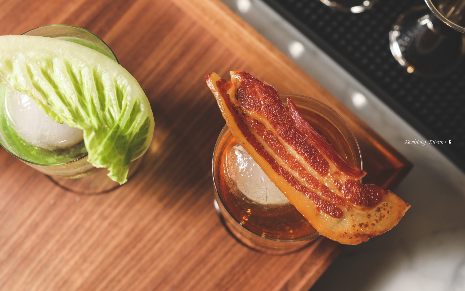 Bacon- 精選波本威士忌以及帶有煙燻味的威士忌,培根肉會噴上楓糖威士忌調出的醬料再用火烤香,培根香氣四溢的油脂滴入調酒中,讓口味更加鮮明。