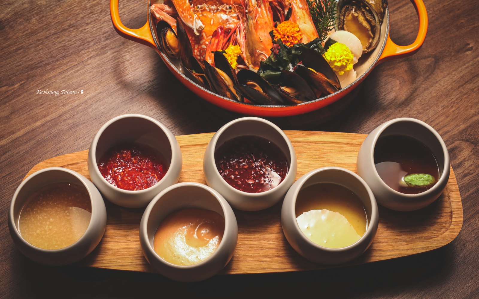 品嚐時,可吃海鮮原味,也可佐主廚特製的六味沾醬,有昆布柴魚哇沙米、柚子味噌和風醬、乾蔥紅酒醋、干邑雞尾酒、台式五味醬、竹山老薑醋,可品嚐六種不同風味!