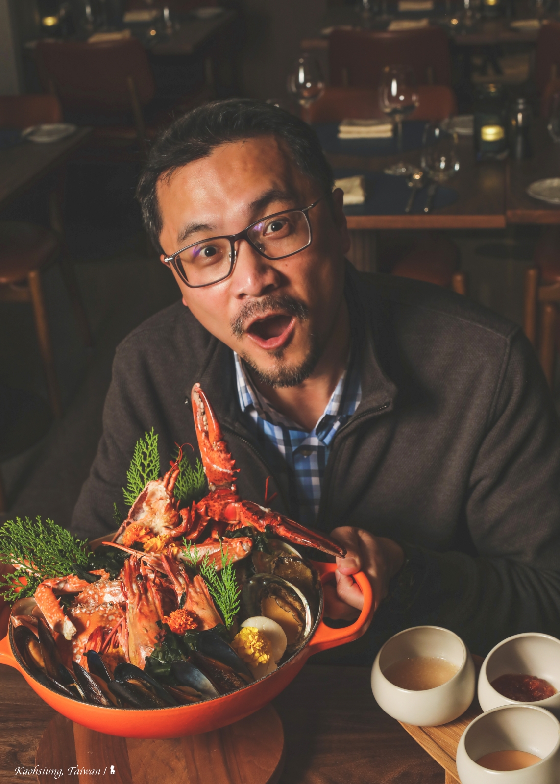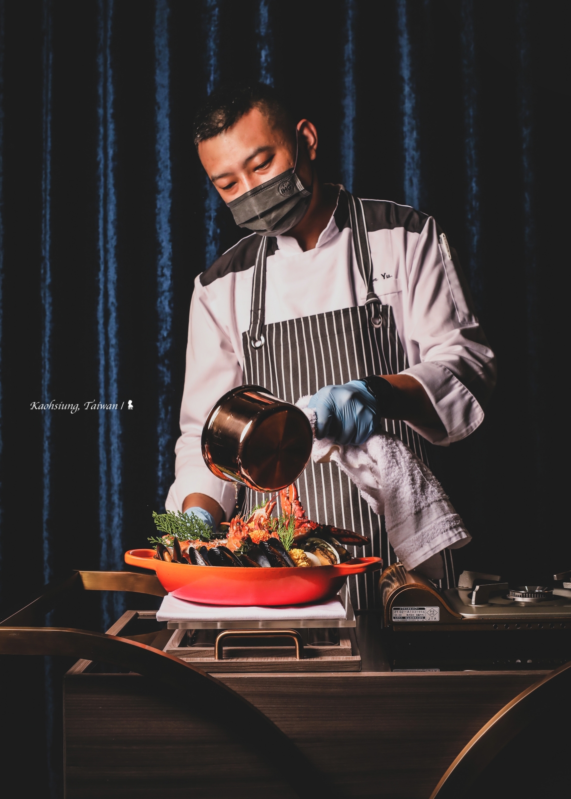 這晚來品嚐豪華的週末晚餐,採用 Semi Buffet,亦即點了主餐可享用這的沙拉吧及甜點吧,我尤其喜歡白亮亮的沙拉吧,提供的生菜與調味沙拉都相當新鮮與可口。主餐部分別有海陸料理可選,這餐品嚐不管是視覺或使用食材都相當奢華的新改版主餐「酒香焰燒海鮮雙人分享盤」,滿滿一個鍋子裡有波士頓龍蝦、台灣海蟹、南非鮑魚、北海道干貝、法國小淡菜及根島蝦等生鮮海味,蒸烤後會於桌邊服務加熱干邑白蘭地,以火焰酒香激發鮮美海味,實在過癮!