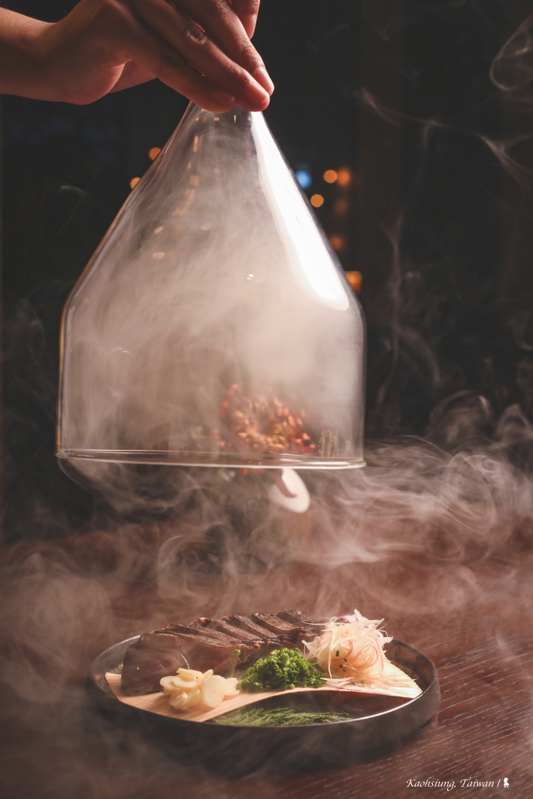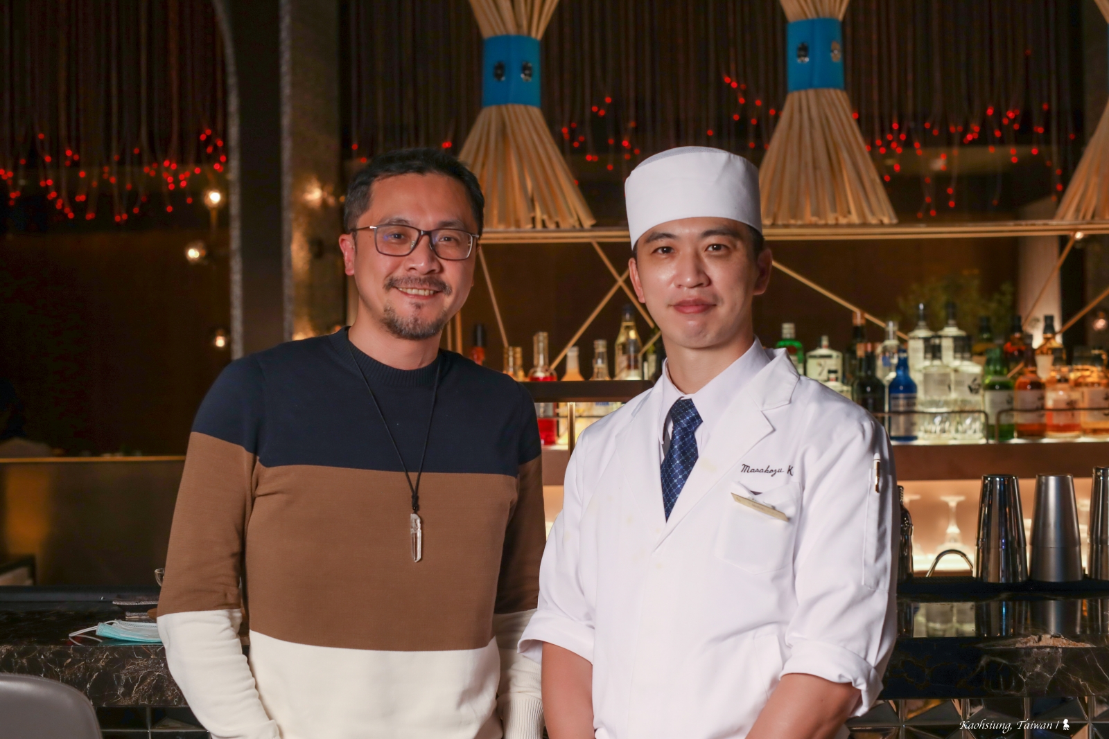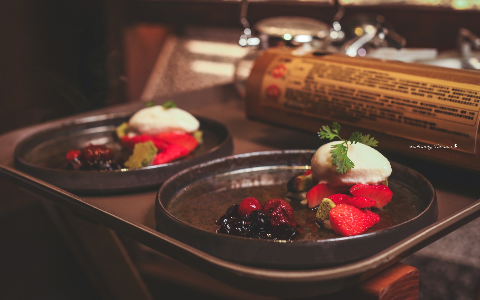 從率先上桌的「鴨肝壽司」就讓我知道這餐值得期待!選用北美的鴨肝處理的完全沒有腥味,醋飯則是選用北海道夢美人米,外面使用最中餅包夾,一脆一嫩,創造有趣口感!「菲力牛佐木之芽味噌醬」的菲力是用木炭烤過,木之芽是山椒嫩芽與京都味噌醬做調和,這道菜讓我驚喜的是還加了台灣的麻竹筍。負責飽足感的「藁燒鮭魚親子飯」,同樣使用北海道的夢美人米,上頭是稻草炙燒的挪威鮭魚,然後放上鮭魚卵,於是取名親子。最後壓軸甜點是「綜合莓果酒粕冰淇淋」,料理長會到桌邊服務,淋上白蘭地,當火焰遇上冰,又是一次滿足視覺與嗅覺的饗宴!