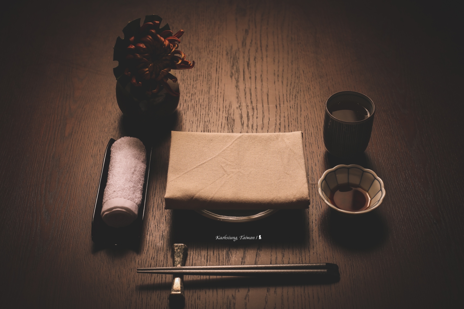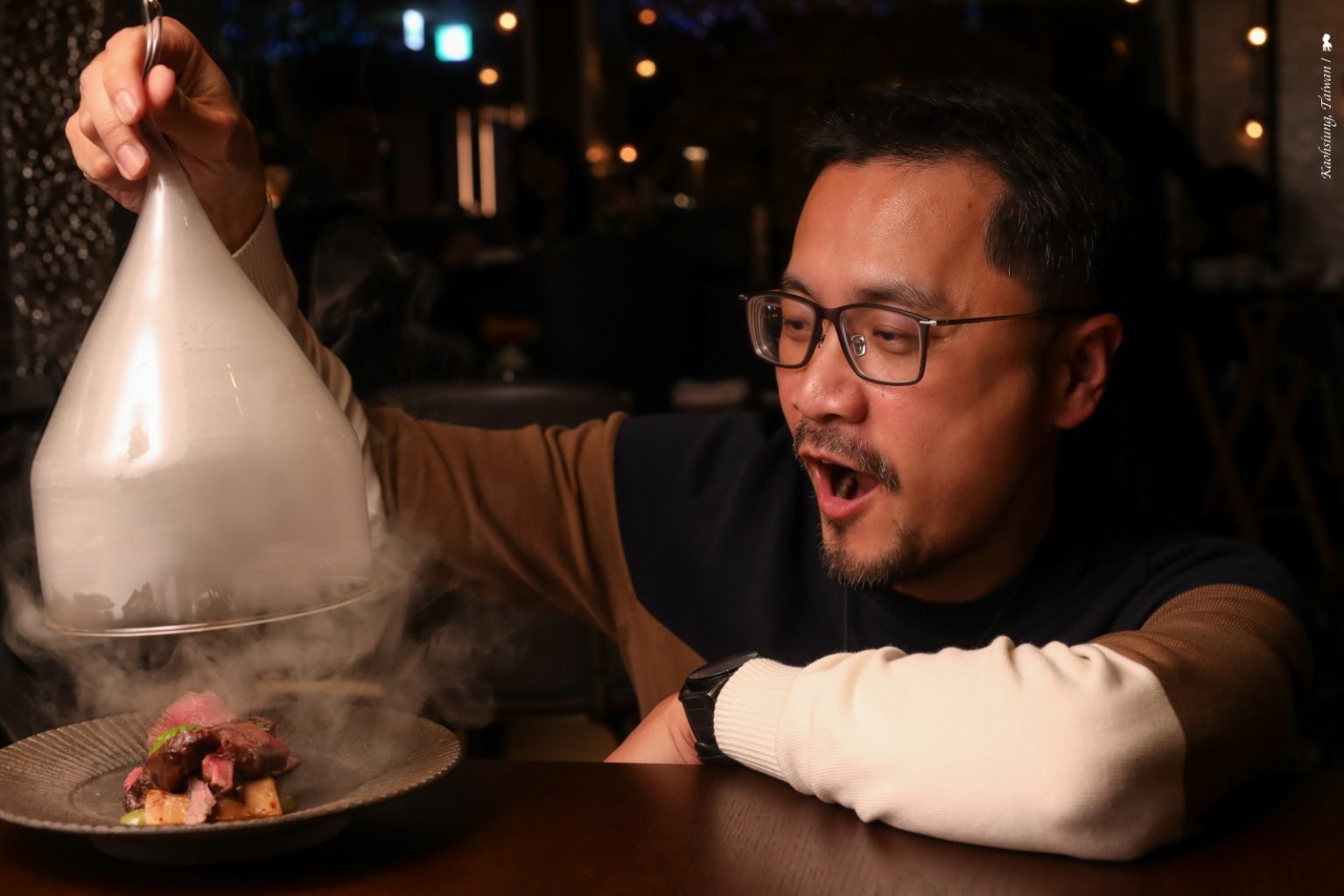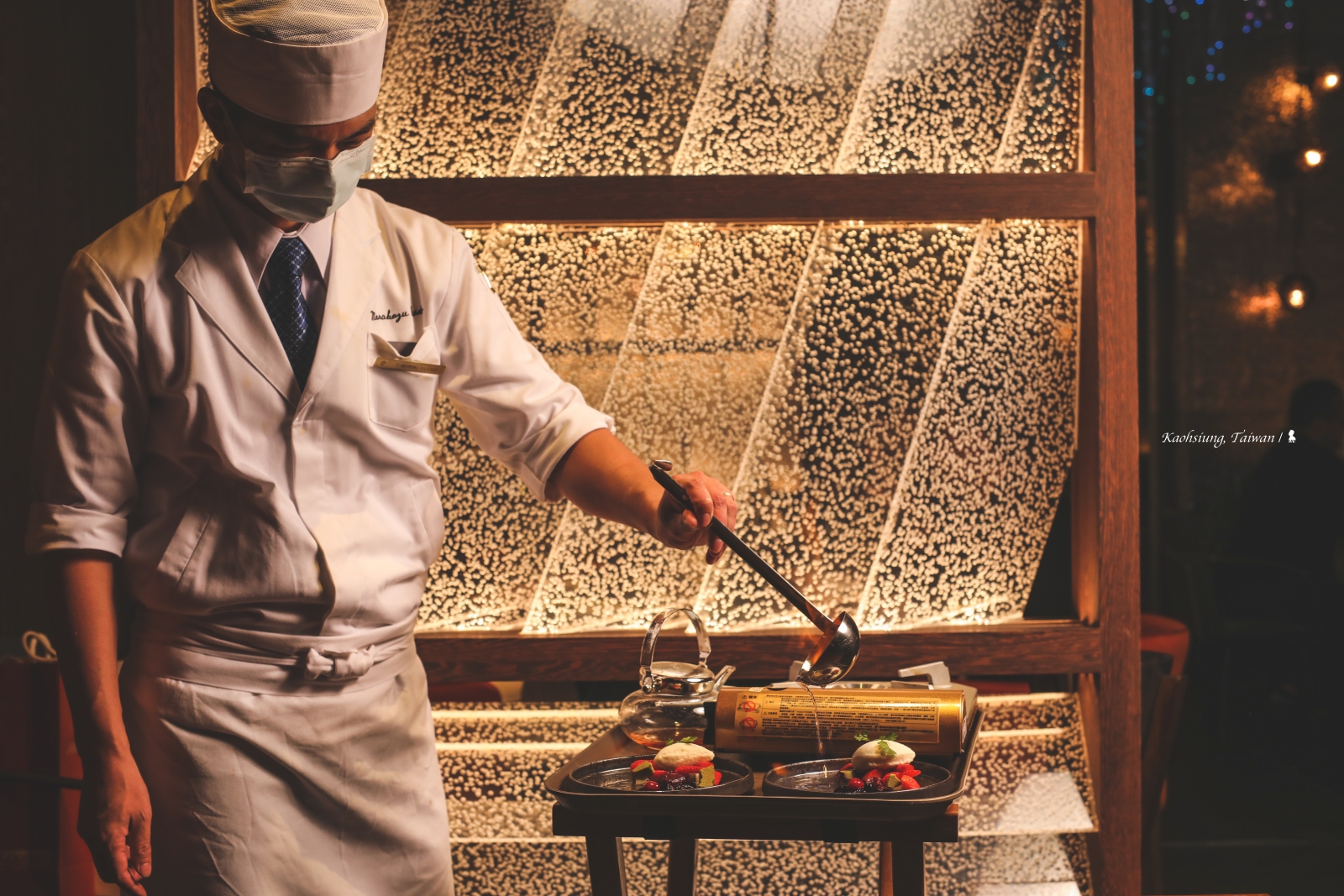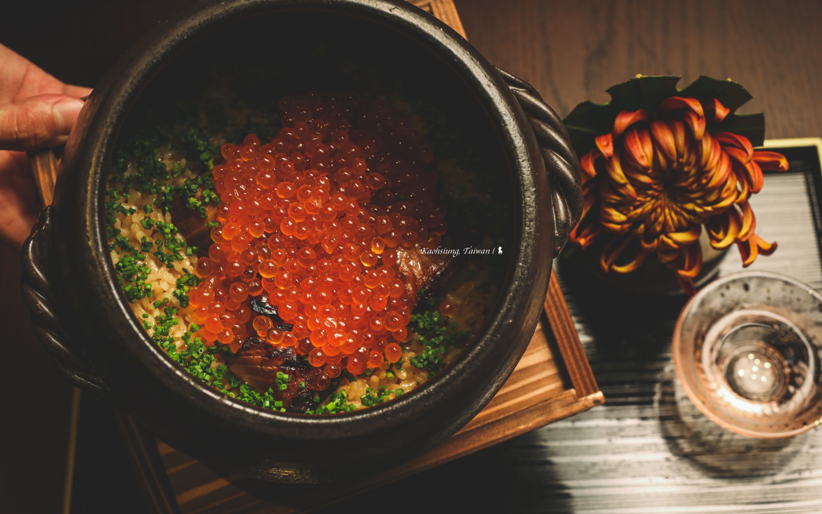 從率先上桌的「鴨肝壽司」就讓我知道這餐值得期待!選用北美的鴨肝處理的完全沒有腥味,醋飯則是選用北海道夢美人米,外面使用最中餅包夾,一脆一嫩,創造有趣口感!「菲力牛佐木之芽味噌醬」的菲力是用木炭烤過,木之芽是山椒嫩芽與京都味噌醬做調和,這道菜讓我驚喜的是還加了台灣的麻竹筍。負責飽足感的「藁燒鮭魚親子飯」,同樣使用北海道的夢美人米,上頭是稻草炙燒的挪威鮭魚,然後放上鮭魚卵,於是取名親子。最後壓軸甜點是「綜合莓果酒粕冰淇淋」,料理長會到桌邊服務,淋上白蘭地,當火焰遇上冰,又是一次滿足視覺與嗅覺的饗宴!