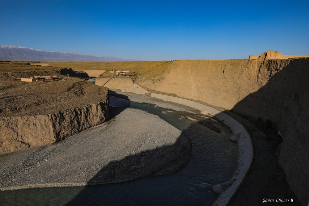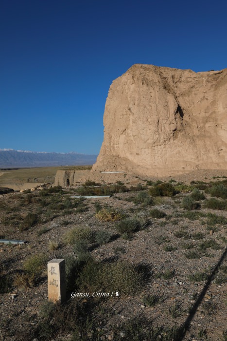 隔日在嘉峪關市醒來的清晨,我從房間陽台欣賞山稜積雪的祁連山後,驅車前往位於嘉峪關南討賴河岸的天下第一墩。始建於明嘉靖十一年(1533年),是明長城西段的第一墩台,因此有了這天下第一墩的封號。墩台矗立於 57 公尺高的垂直河岸上,地形險要,墩台殘高 8.3 公尺、底邊東西寬14.3米,前面一個石碑上刻著「第一墩 萬里長城從這裡開始」,告訴人們眼前這看似平凡的黃土夯築,在歷史地位上是如何的不平凡。