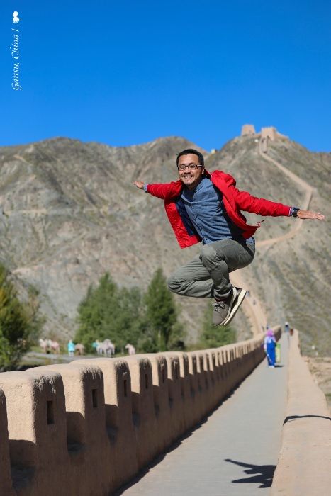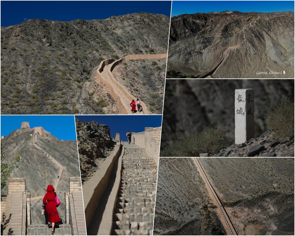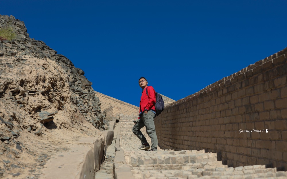 懸臂長城是嘉峪關古代軍事防禦體系的重要部分,建於明嘉靖十八年(1539年),由當地礫石與黃土夯築而成,今日所見明長城只留下 750 公尺,其餘者都是1987年後來修繕。懸臂長城,這帶點武俠小說味道的名字,是其建築於約四十五度的山脊上,如凌空倒掛的手臂,壯觀的同時又帶些孤寂。時間有限但又貪心想要用空拍機攝下這黑山上的一道防線,於是先一鼓作氣、氣喘吁吁的攻上後,再趕緊下山進行空拍,此刻略為發抖的不是雙腿而是操作遙控器的雙手,從監控螢幕上欣賞自然地景與人類建築的交會,那股震撼,讓我激動也感動!