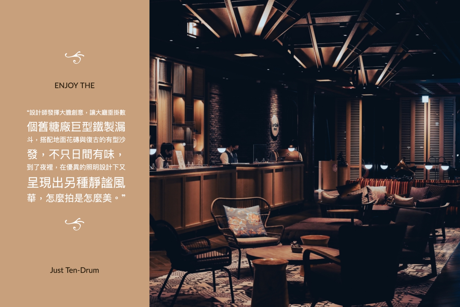 捷絲旅台南十鼓館外觀是以糖的結晶體為靈感來呼應糖廠歷史,室內空間融合鼓樂元素及糖廠溫潤的色調,設計師發揮大膽創意,讓大廳垂掛數個舊糖廠巨型鐵製漏斗,搭配地面花磚與復古的有型沙發,不只日間有味,到了夜裡,在優異的照明設計下又呈現出另種靜謐風華,怎麼拍是怎麼美。
