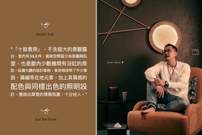 飯店樓高十層有 129 間房、共規劃 8 種房型,本次入住的「十鼓套房」,不含超大的景觀露台、室內有 14.5 坪,寬敞空間區分為客廳與臥室,也是館內少數幾間有浴缸的房型。延續大廳的設計風格,客房裡使用了不少像鼓、藤編等在地元素,加上具質感的配色與同樣出色的照明設計,營造出摩登的懷舊氛圍,十分迷人。