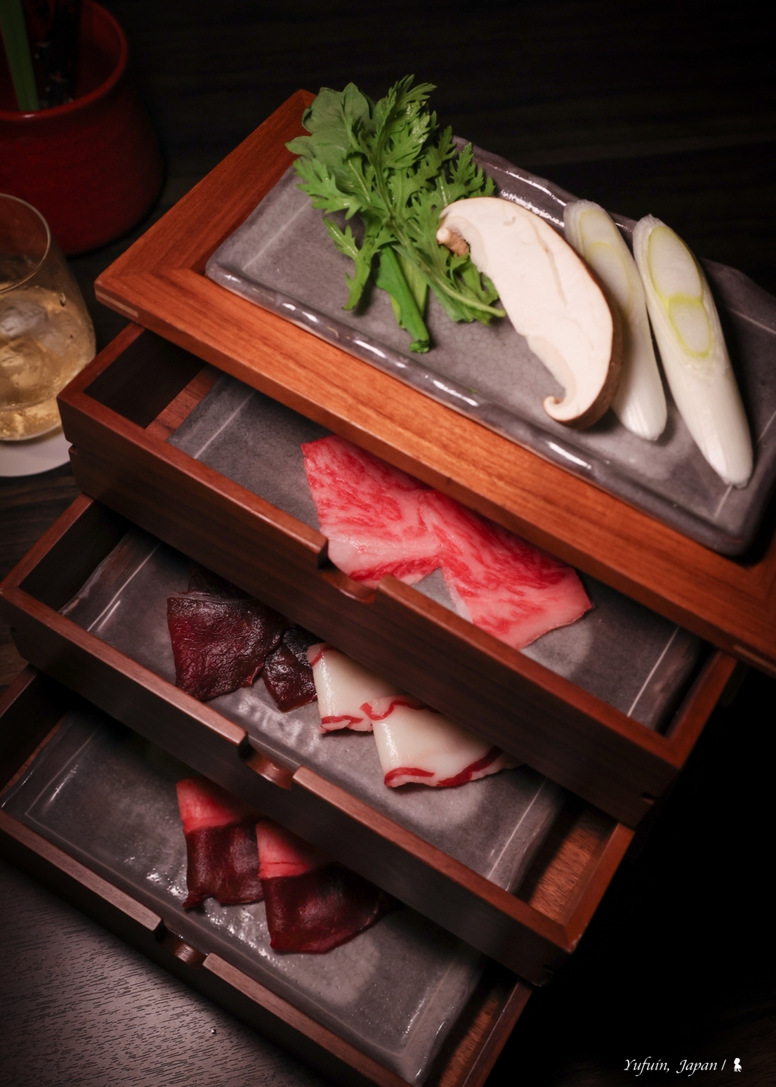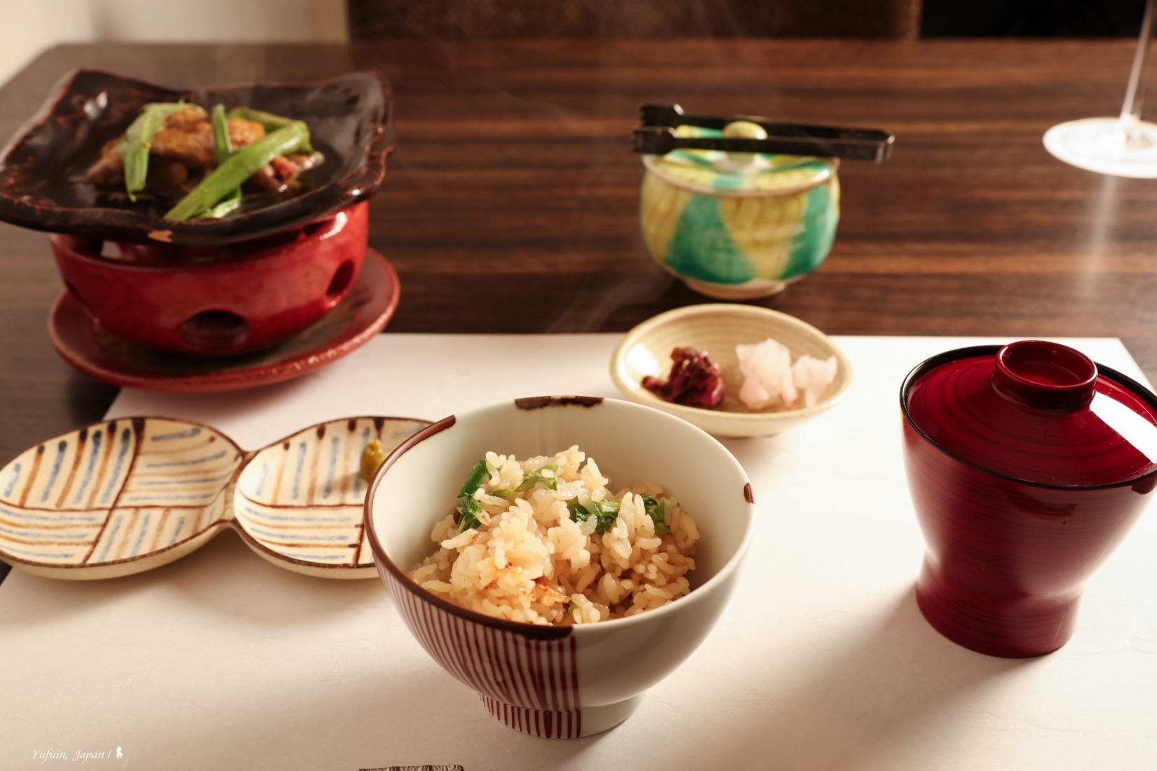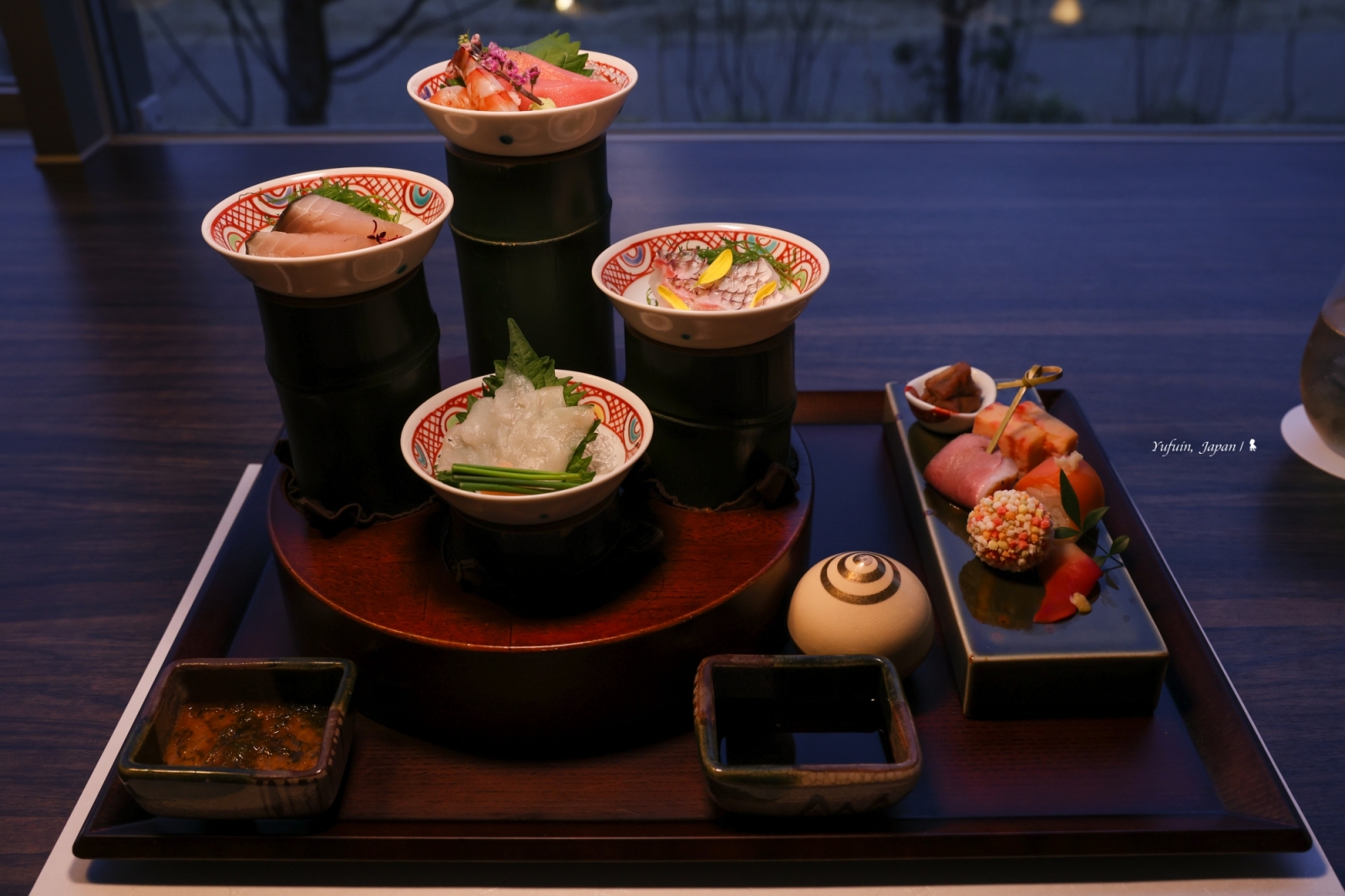 晚餐分為 17:30 與 19:30 兩個梯次,首晚選擇了 17:30 的場次,剛好能靜靜欣賞日落後的薄暮時分,梯田間的燈火漸次點亮,氛圍寧靜又詩意。坐在窗邊,一邊品味美食,一邊感受由布院的夜色變化,這一餐,從視覺到味覺都是享受,吃到一半,我還忍不住中途跑出去拍藍調時間下的梯田光影。不得不要大力稱讚「界 由布院」的料理,精緻又美味,每道菜都能感受到料理人的用心,更讓我嚐到前所未有的 「野味」!