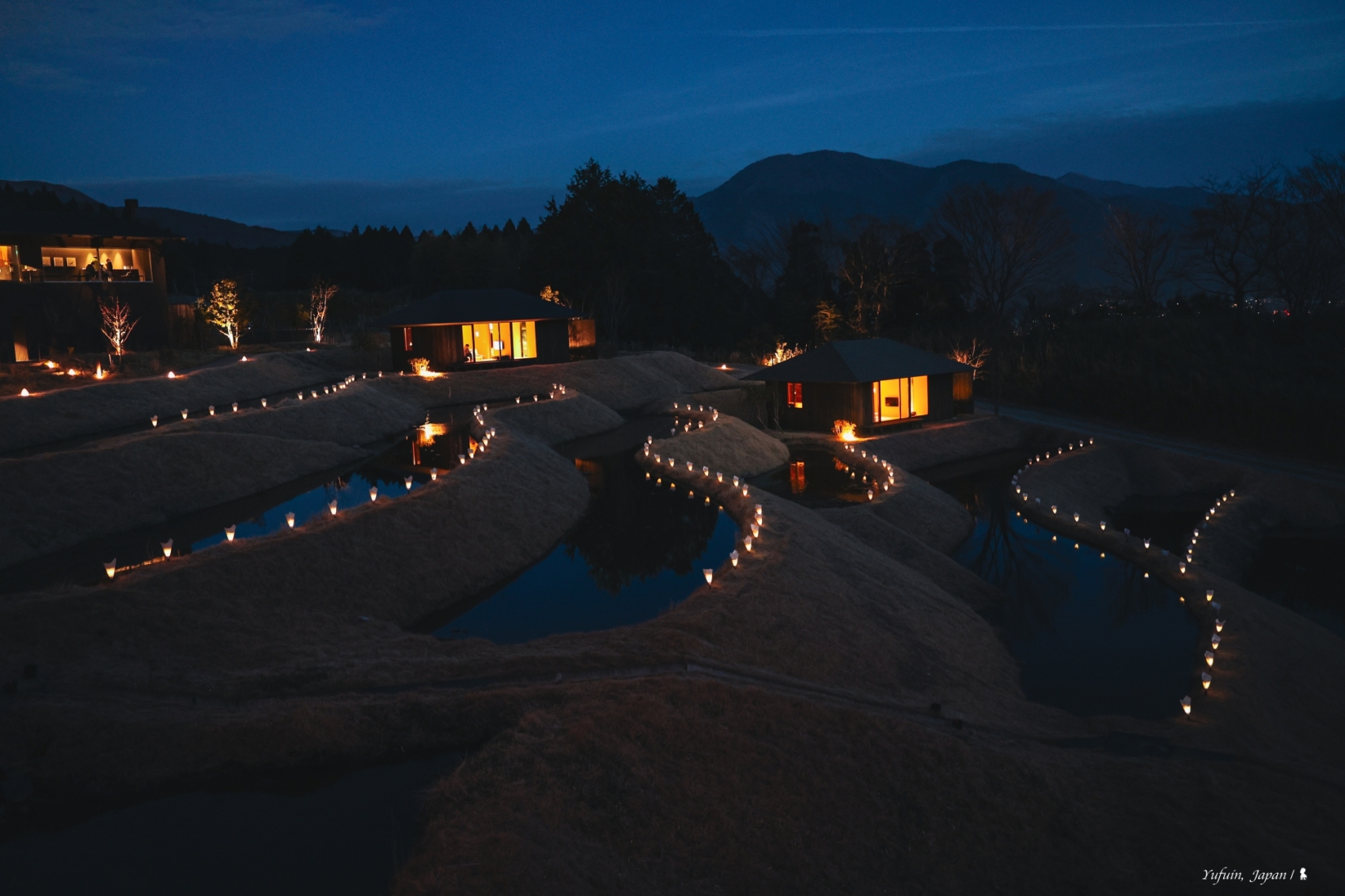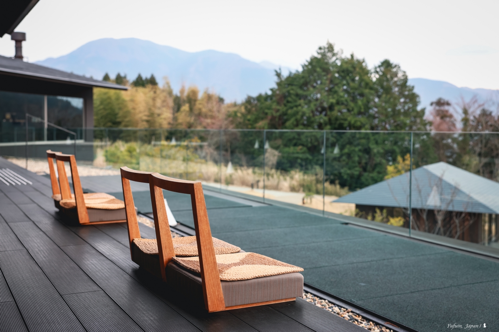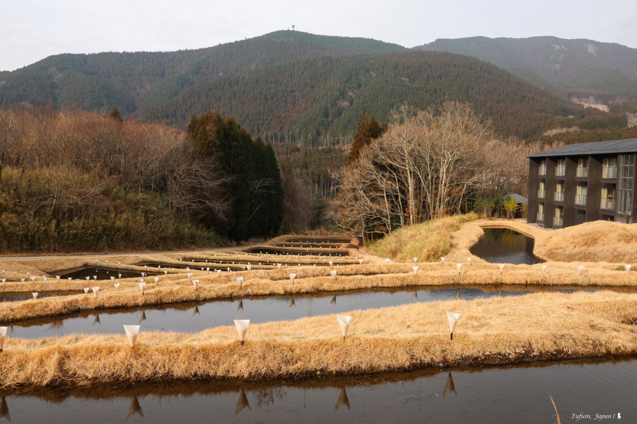 在隈研吾設計的公共溫泉空間中,旅人可一邊浸泡露天溫泉,一邊遠眺雄偉的由布岳,近賞梯田意象的造景,感受大自然的療癒能量。晨曦雲霧繚繞、午後陽光斜照、夜晚星光點點,每個時刻都各有不同風情,更不用說四季更迭帶來的細膩變化了!在這裡,泡湯不只是療癒,更是享受與土地、山嶺、時光相連的靜謐片刻。