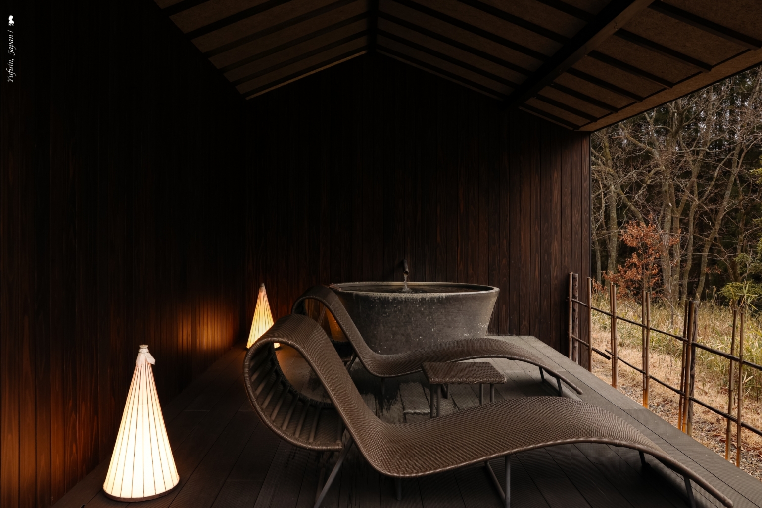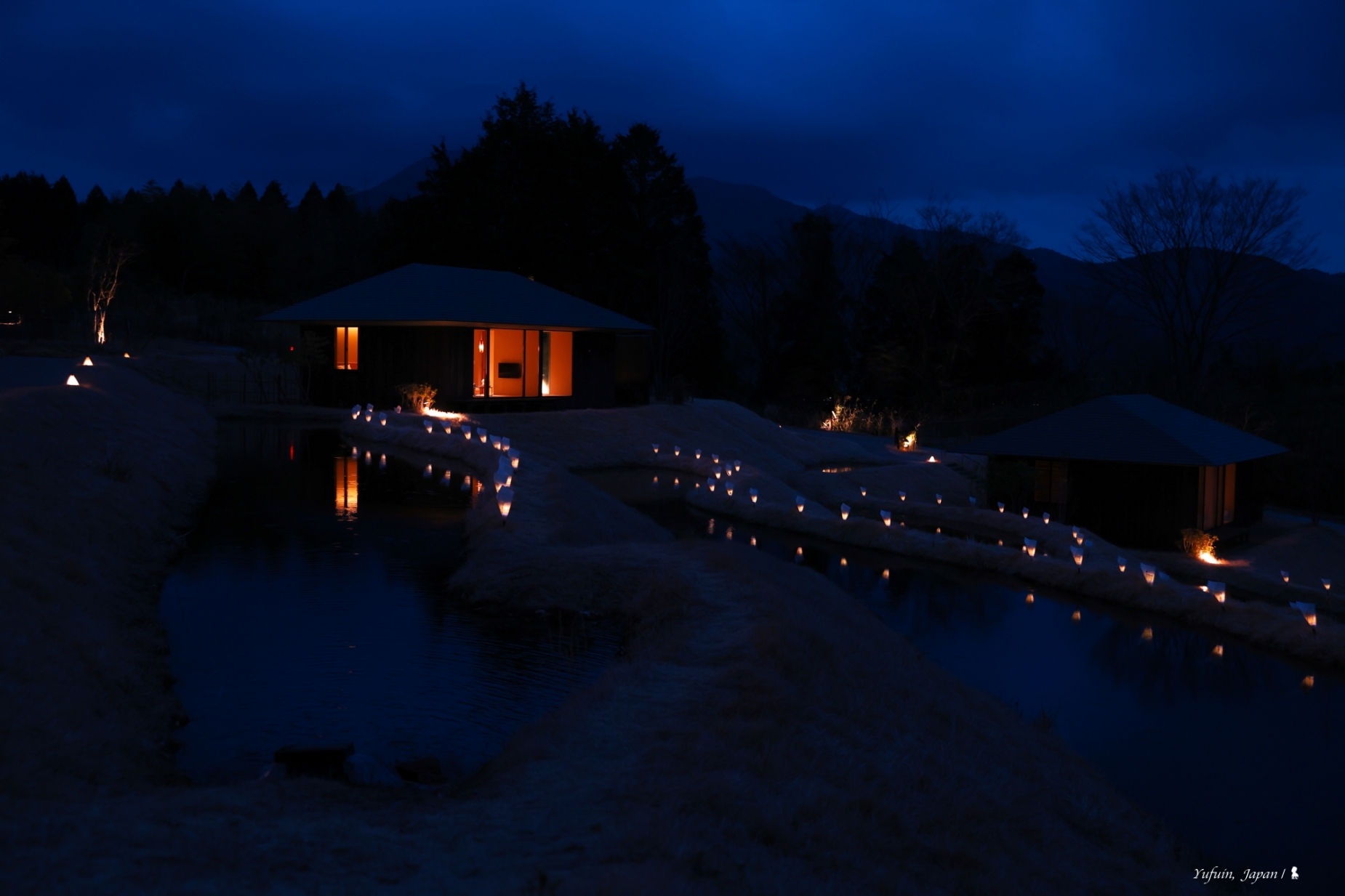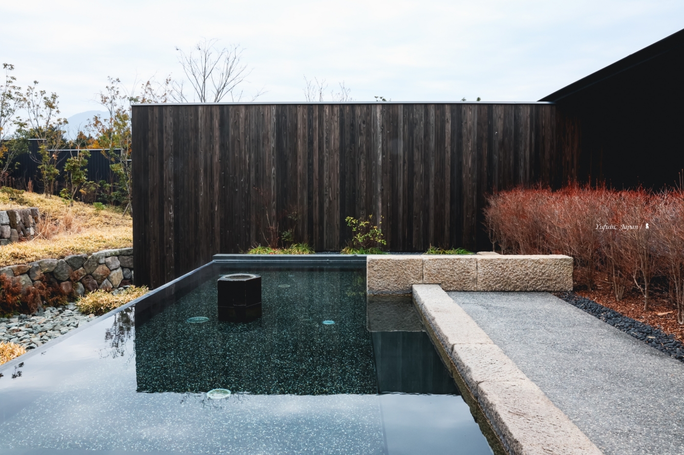 在隈研吾設計的公共溫泉空間中,旅人可一邊浸泡露天溫泉,一邊遠眺雄偉的由布岳,近賞梯田意象的造景,感受大自然的療癒能量。晨曦雲霧繚繞、午後陽光斜照、夜晚星光點點,每個時刻都各有不同風情,更不用說四季更迭帶來的細膩變化了!在這裡,泡湯不只是療癒,更是享受與土地、山嶺、時光相連的靜謐片刻。