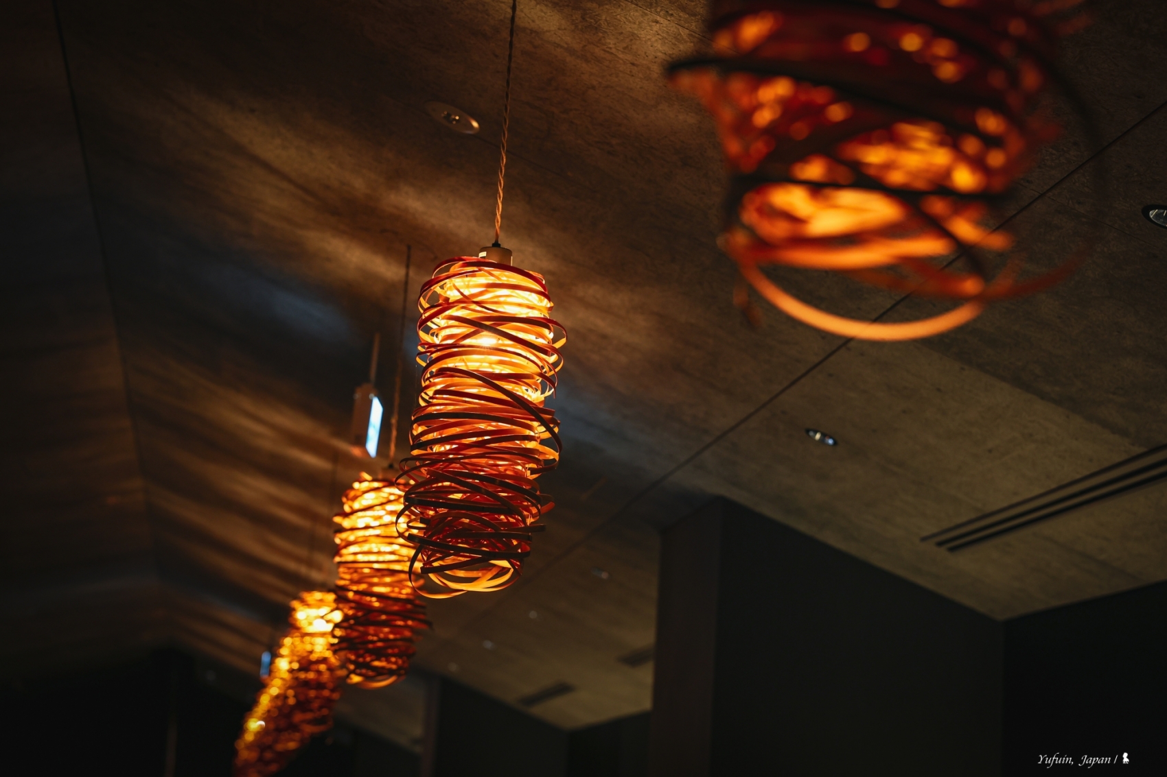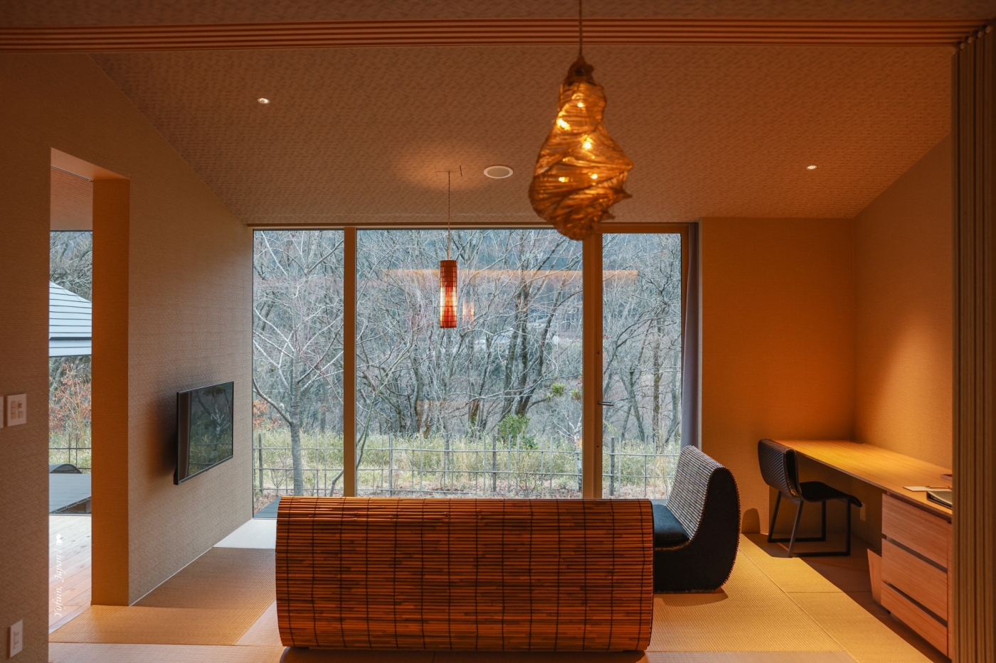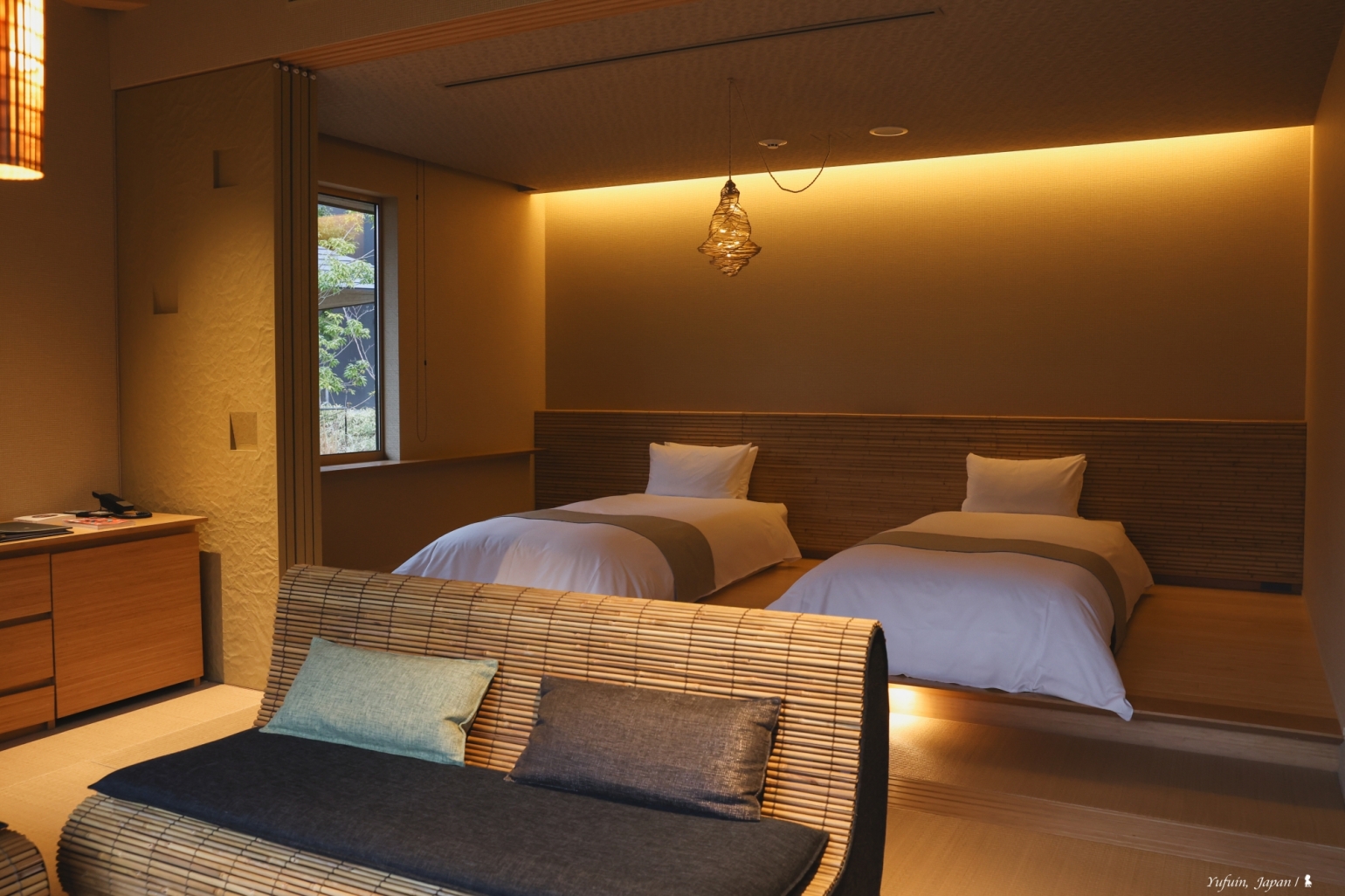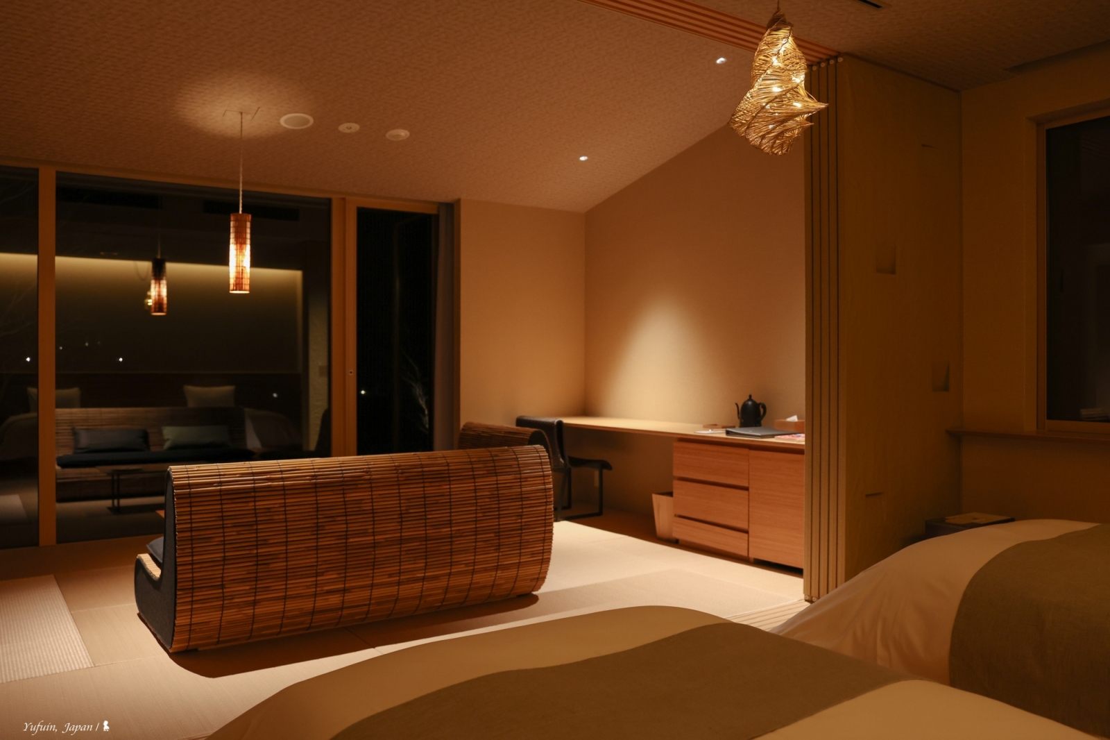 界 由布院的所有客房皆融入在地特色,例如房內大量使用九州大分縣產量全日本第一的苦竹,應用在床頭板、沙發等細節之中。最迷人的,是那盞宛如螢火蟲般閃爍的「螢籠」吊燈。它的靈感來自由布院水邊夏夜的螢火蟲,燈光忽明忽滅、節奏自然,真的有種小生物在屋內飄舞的錯覺,微光渲染出寧靜的詩意。