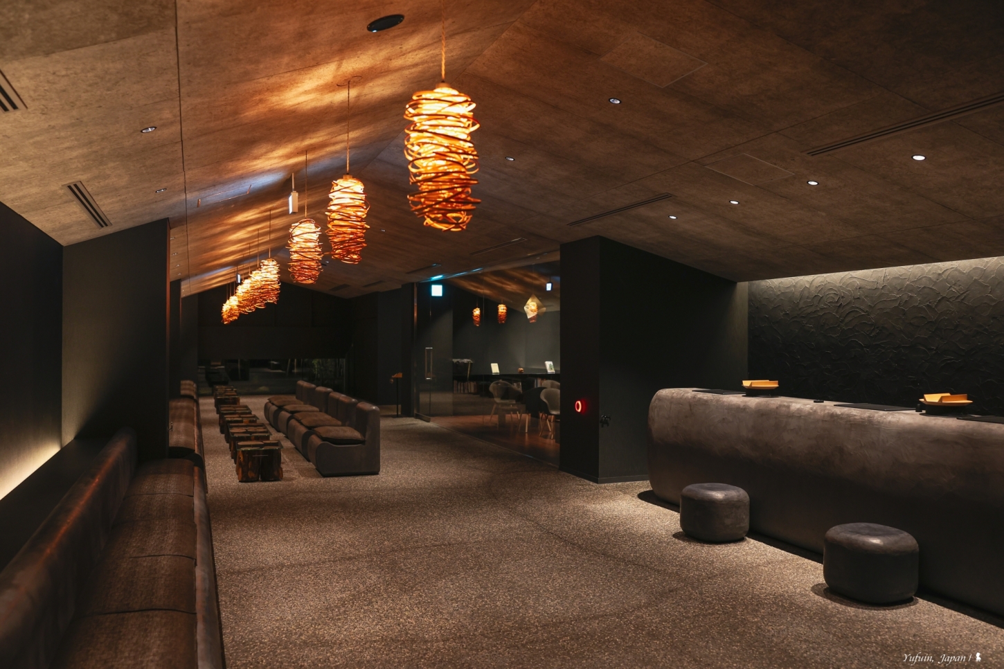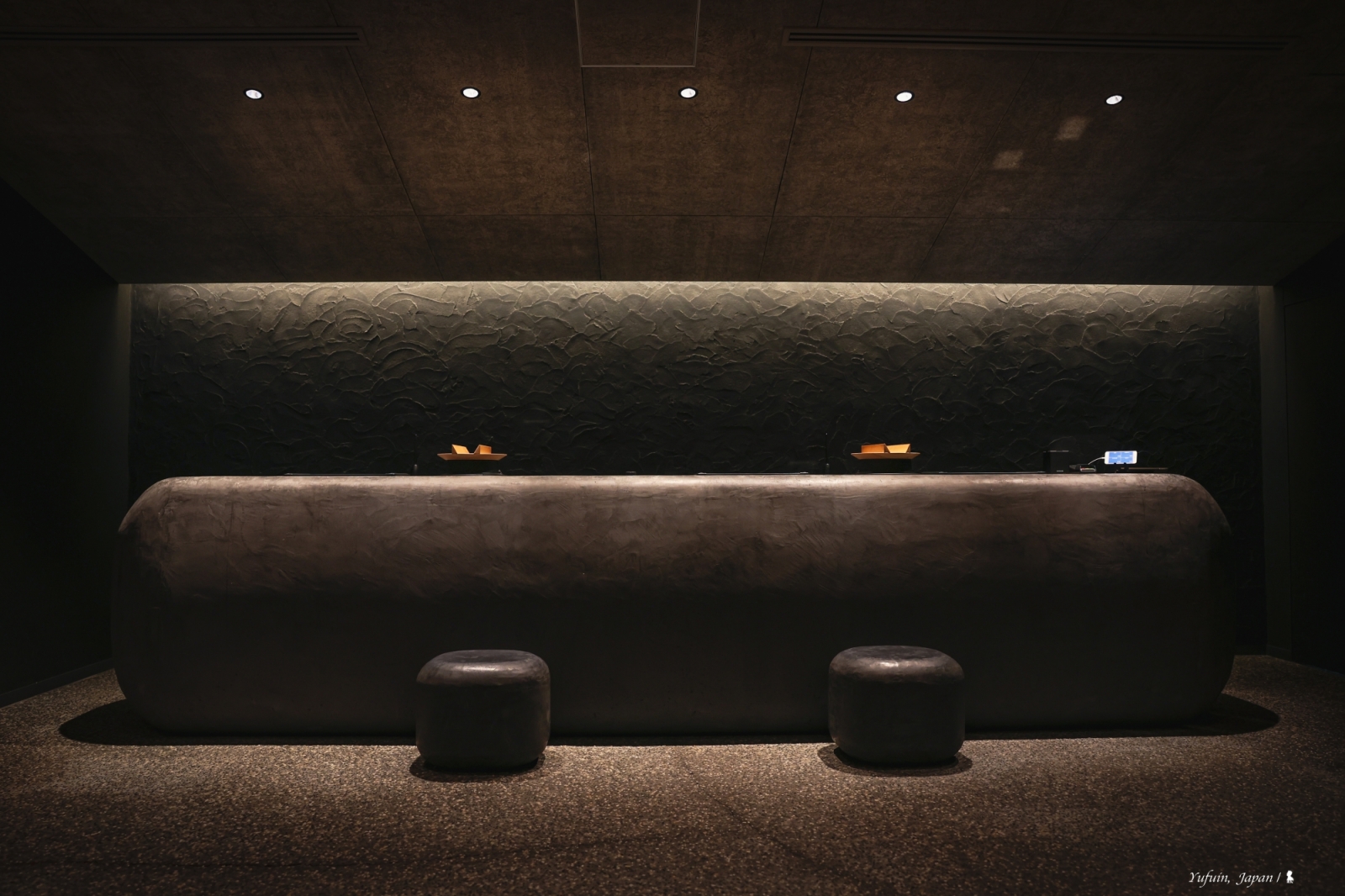 ⇑ 入住櫃檯的設計靈感來自大分縣傳統農家廚房,那座黑灰色調、圓弧形的長櫃檯象徵著農家生活的核心—「灶」