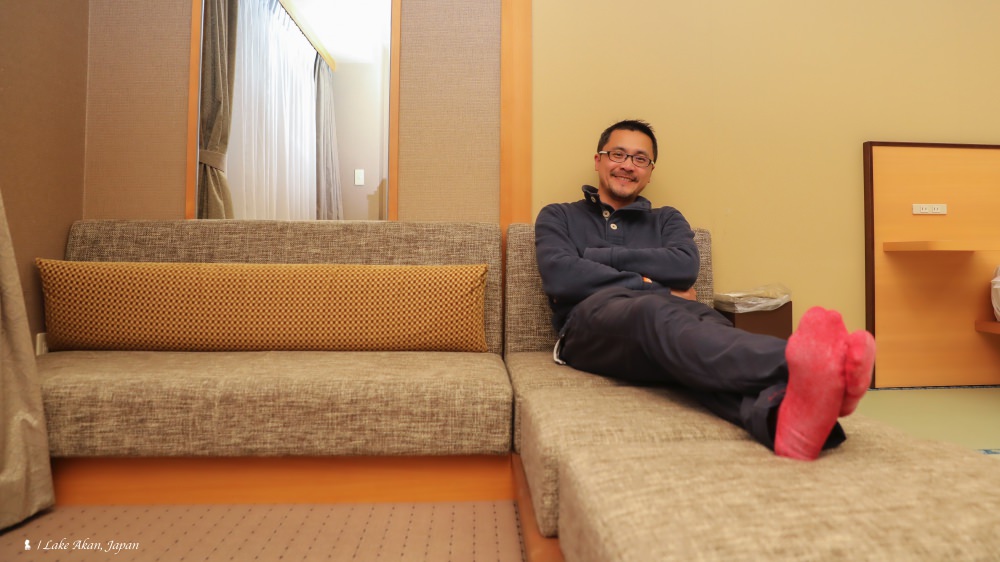 阿寒湖鶴雅之翼酒店大廳,使用許多北海道原住民愛努族的元素,若對愛努文化有興趣,夜晚可散步去阿寒愛努劇場欣賞傳統舞蹈表演。這回入住房間是我很愛的和式房,睡在榻榻米上的床墊,靠窗區域還有放在地板上的 L 型布沙發,整體相當舒適。