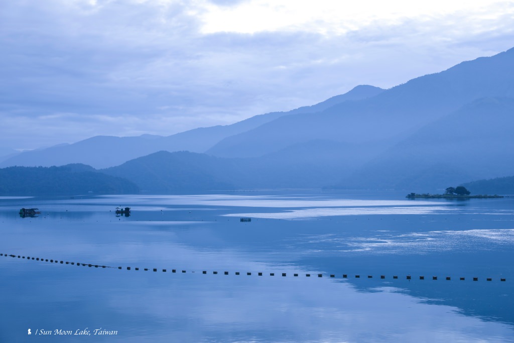 陽光尚未升起的日月潭,靜謐湖面與疊疊重山,美的像幅畫,我把相機色溫設定在 3200-3500K 間,拍攝出的淡藍色湖景,像演奏著爵士。