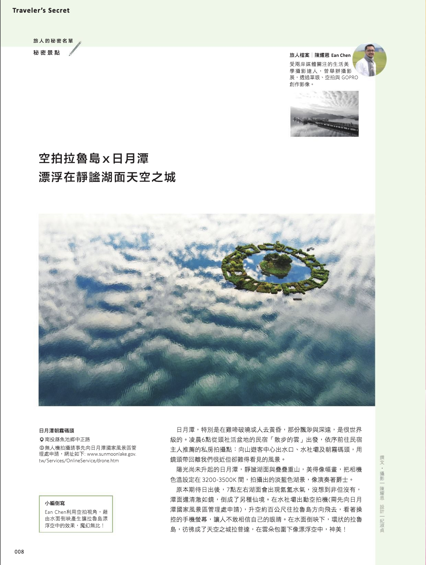 原期待日出後,七點左右湖面會出現氤氳水氣,沒想到非但沒有,潭面還清澈如鏡,倒成了另種仙境。我在水社壩出動空拍機(需先向日月潭國家風景區管理處申請),升空約百公尺往拉魯島方向飛去,看著操控的手機螢幕,我不敢相信自己的眼睛。在水面倒映下,環狀的拉魯島,彷彿成了天空之城拉普達,在雲朵包圍下像漂浮空中,神美!