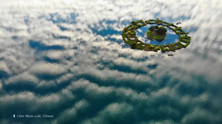 原期待日出後,七點左右湖面會出現氤氳水氣,沒想到非但沒有,潭面還清澈如鏡,倒成了另種仙境。我在水社壩出動空拍機(需先向日月潭國家風景區管理處申請),升空約百公尺往拉魯島方向飛去,看著操控的手機螢幕,我不敢相信自己的眼睛。在水面倒映下,環狀的拉魯島,彷彿成了天空之城拉普達,在雲朵包圍下像漂浮空中,神美!