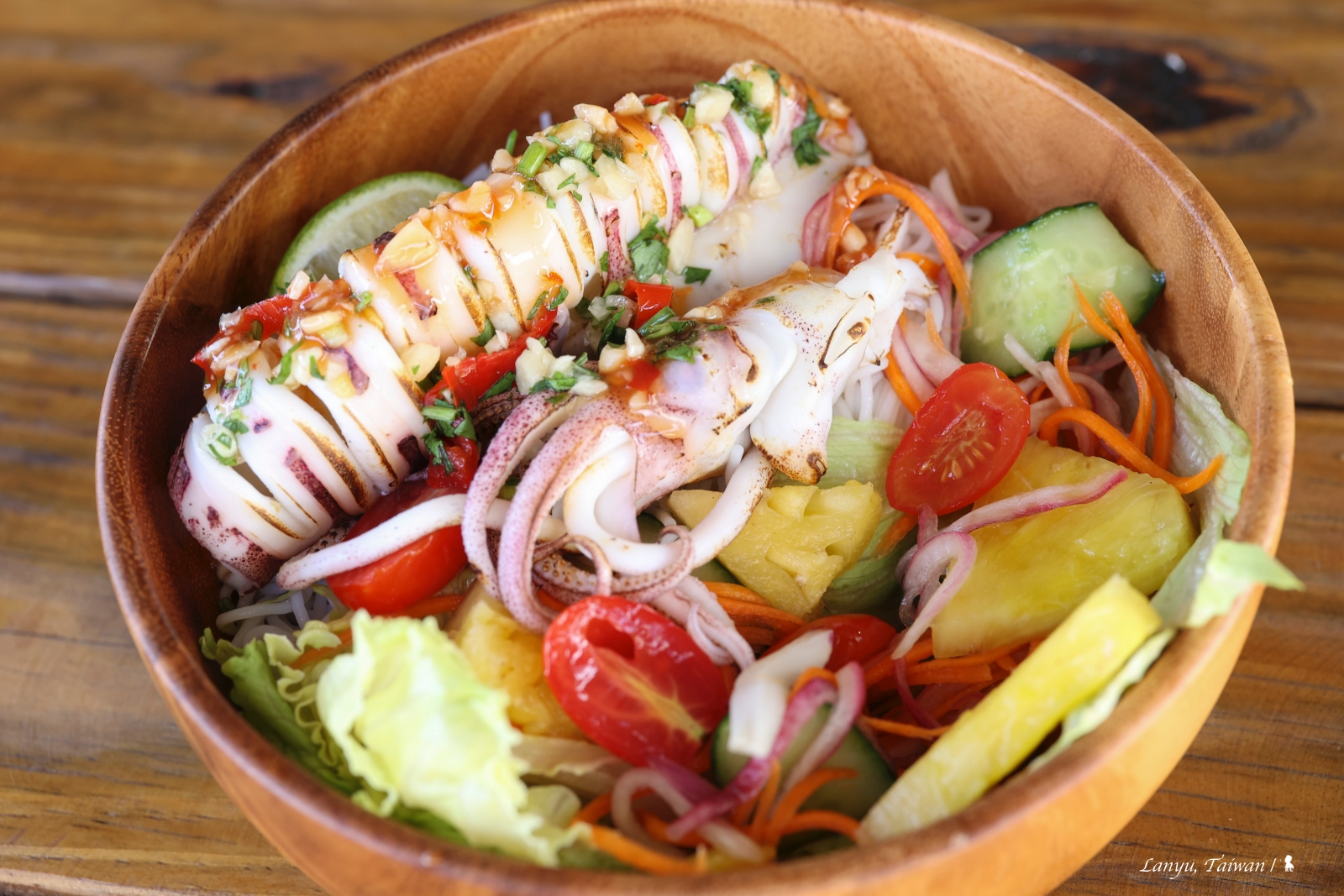 有遮蔭的半露天無敵海景雅座,八代灣多彩的藍盡收眼底,雖沒冷氣,正中午吹著海風也還算舒服。炎炎夏日首推「越式海鮮冷麵」,新鮮彈牙的當令海鮮搭配鳳梨等蔬果,再淋上特製的香甜酸辣醬汁,超適合在熱爆的天開胃食用,對了,麵條口感也好,感覺有被冰鎮過保持相當彈性。