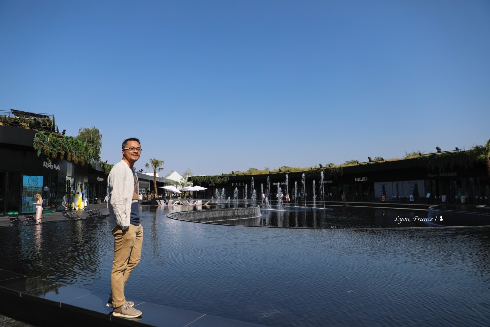 正如英文名字,一棟棟雪白的三角斜頂店面相連,背後設計是想要重現滑雪勝地伊澤爾(Isère)的法國傳統村莊氛圍,除了 78 棟白色斜頂、高約 6 米的木屋造型店面,還打造了人工湖泊、中央廣場並種植了 750 株成熟樹木及 46 萬棵植物與灌木來營造大自然的環境,有意思是入口處一排的黑色建築體,要表現的是傳統法國村莊的城牆,與裡頭白色木屋及盎然綠意呈現了明顯對比。而為了將客人留到晚上,白天帶點禪風的人工湖泊,到了夜晚還會上演由太陽馬戲團設計的水舞及燈光秀!