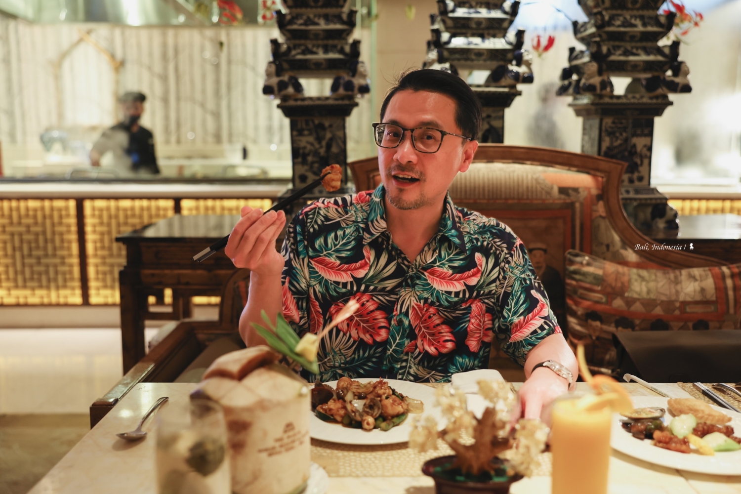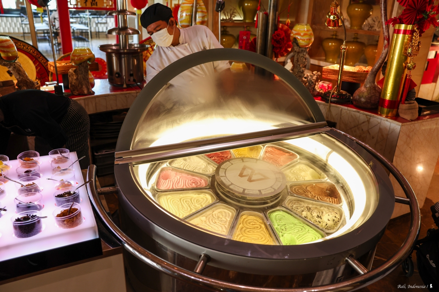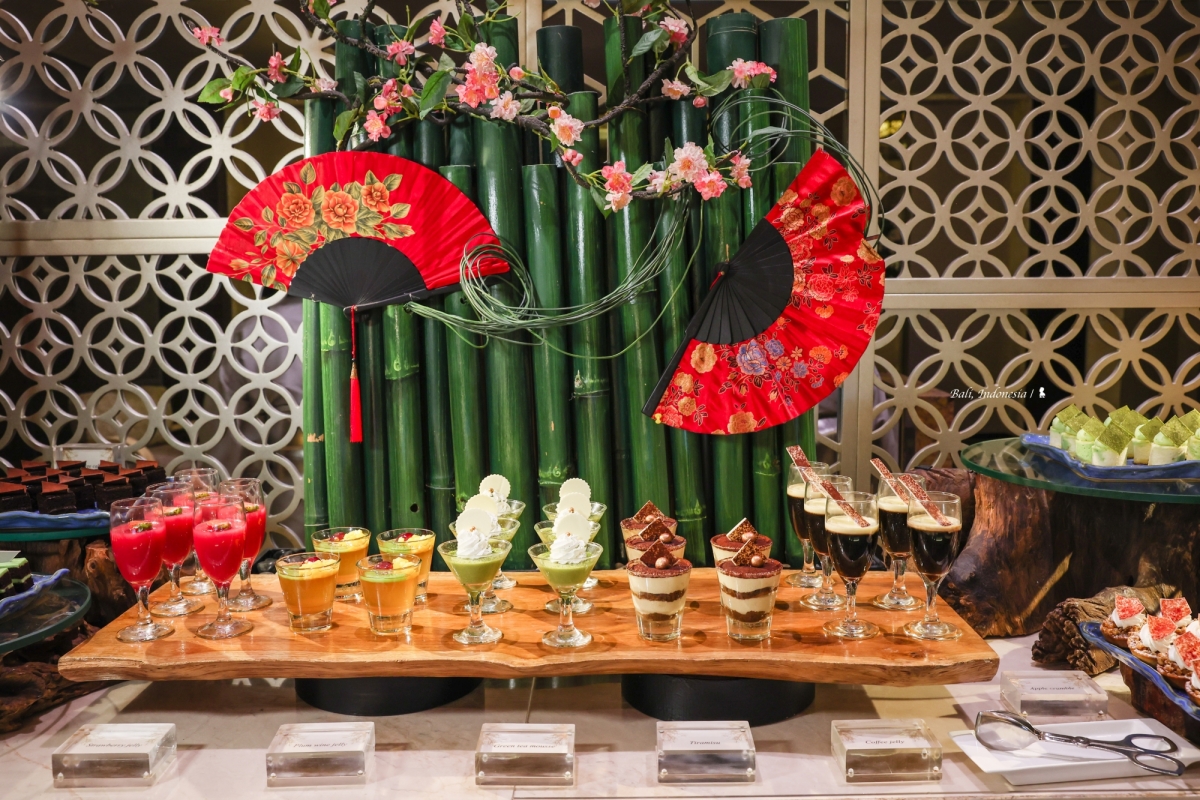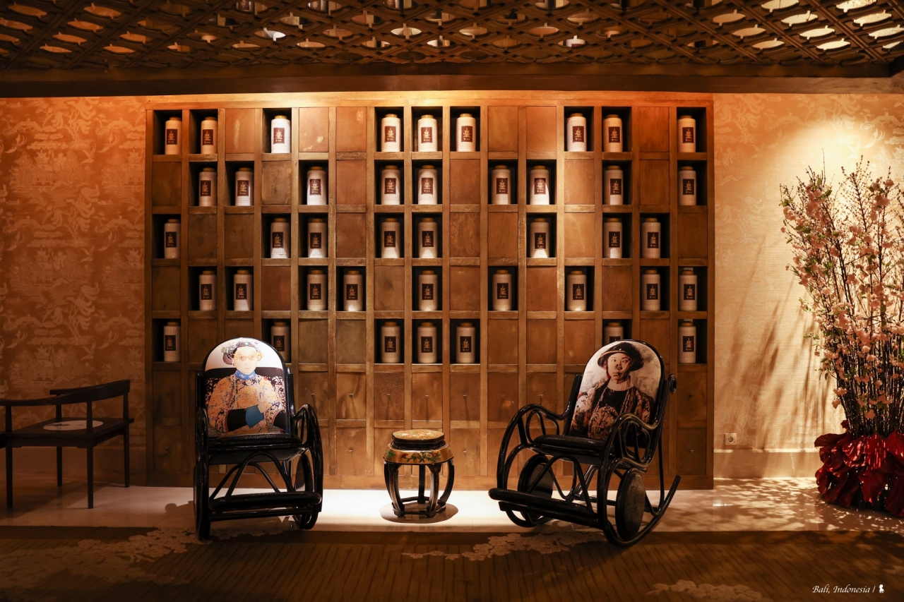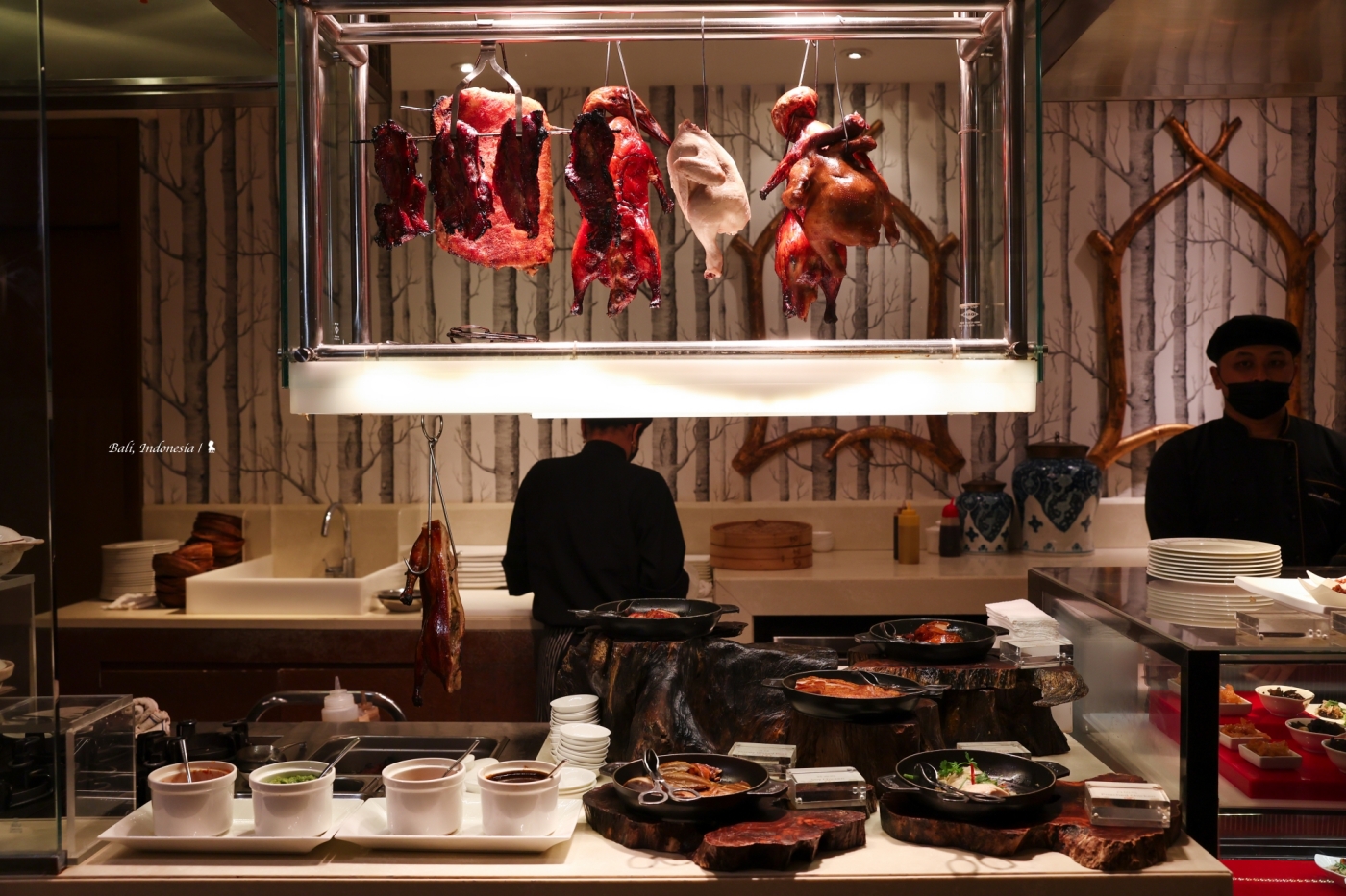 我很驚訝在峇里島會有這樣一間中國料理,先說講究的空間設計與擺飾,頗有西方人眼中充滿東方異國感的中國風,如宮廷般的盛世華美很能滿足想像!餐點部分,跟 EDOGIN 日本餐廳一樣都是採自助式加現場料理,餐檯上有烤鴨、脆皮豬以及很受歡迎的廣式點心像是水晶蝦餃、燒賣等,甜點區玻璃櫥窗裡擺放的楊枝甘露、龜苓膏等中式甜食,讓我佩服餐廳團隊在中國料理準備上的完整性。