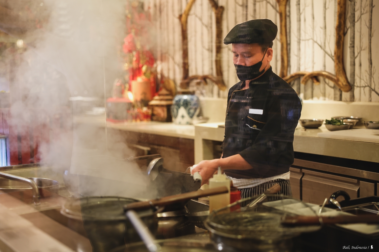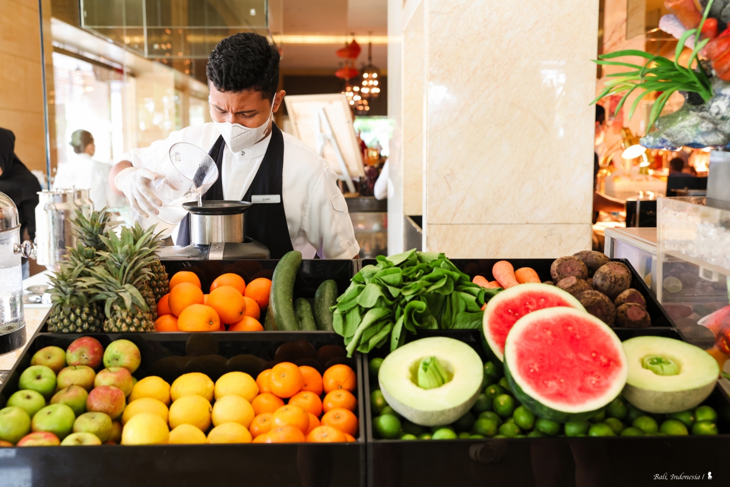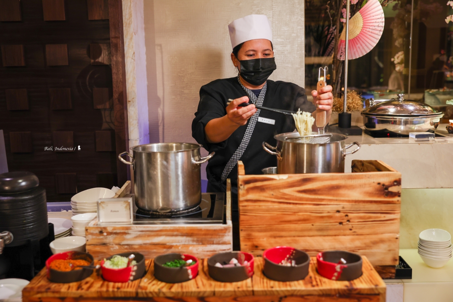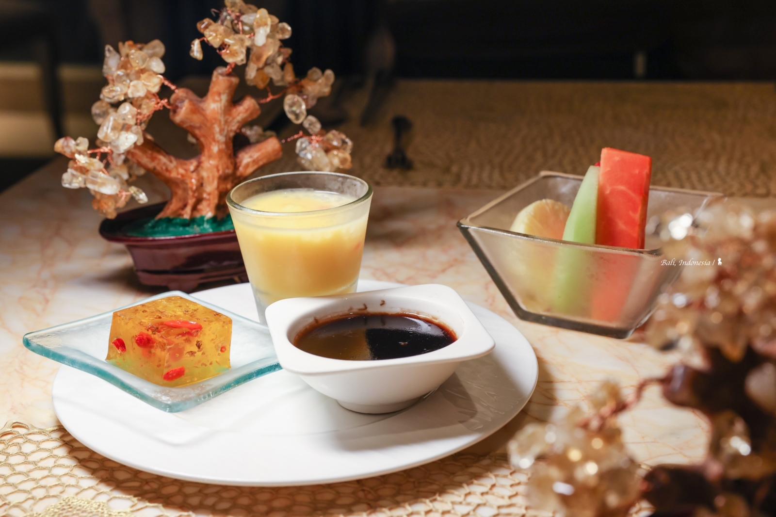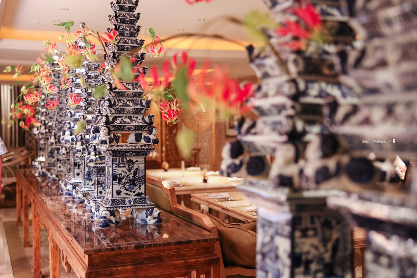 我很驚訝在峇里島會有這樣一間中國料理,先說講究的空間設計與擺飾,頗有西方人眼中充滿東方異國感的中國風,如宮廷般的盛世華美很能滿足想像!餐點部分,跟 EDOGIN 日本餐廳一樣都是採自助式加現場料理,餐檯上有烤鴨、脆皮豬以及很受歡迎的廣式點心像是水晶蝦餃、燒賣等,甜點區玻璃櫥窗裡擺放的楊枝甘露、龜苓膏等中式甜食,讓我佩服餐廳團隊在中國料理準備上的完整性。