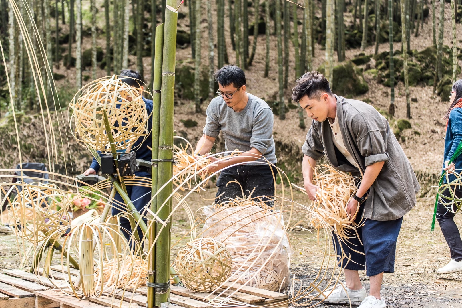 隔日早晨離開露營區後,管家介紹一處他們的私房景點,號稱是台灣保育孟宗竹最好的地方。一般他們會帶領客人造訪然後導覽孟宗竹林隧道,從竹子品種的介紹到分享產業沒落的問題,還會推薦最佳拍攝點。讓我心嚮往之的是他們去年底在這舉辦了一場體驗活動,集結了日本小原流、台灣茶道及竹山竹編三個領域的老師,竹編老師現場剖竹並進行竹編的藝術裝置,一旁的小原流花道老師插花創作歌詠自然,茶道老師以大地為席現場執壺泡茶,用如此風雅的方式享受自然,最是奢華。