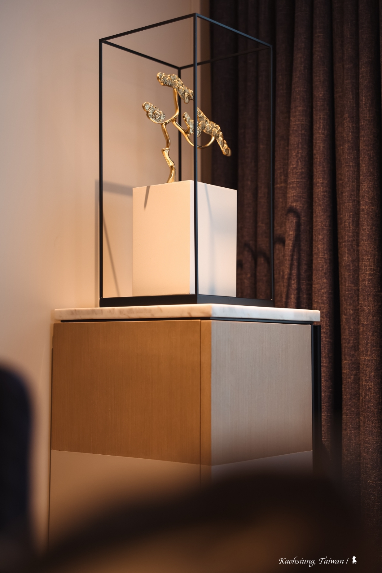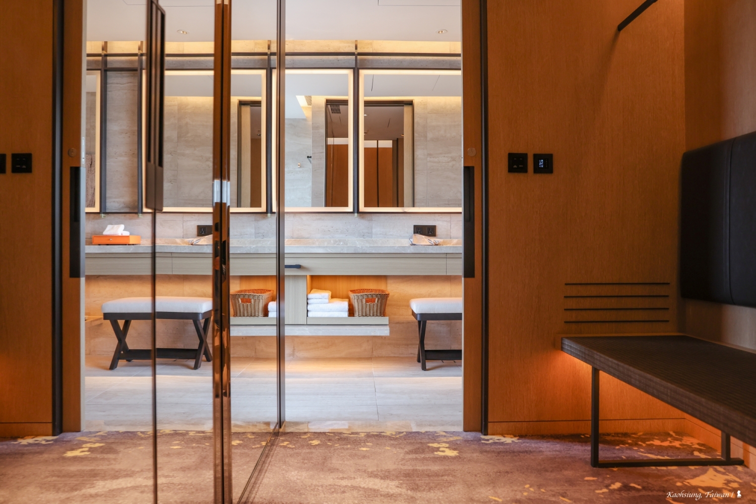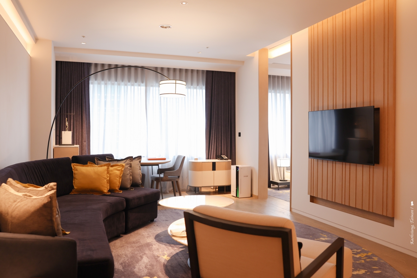 我入住的是260間客房中最具代表性的「琥珀套房」,以高雄海港與工業美學為靈感,房間寬敞且分為客廳、臥室與浴室三個明確區塊。設計團隊巧妙運用沉穩木質調、和風格柵與地方藝術品,營造出低調奢華卻不失溫度的空間。